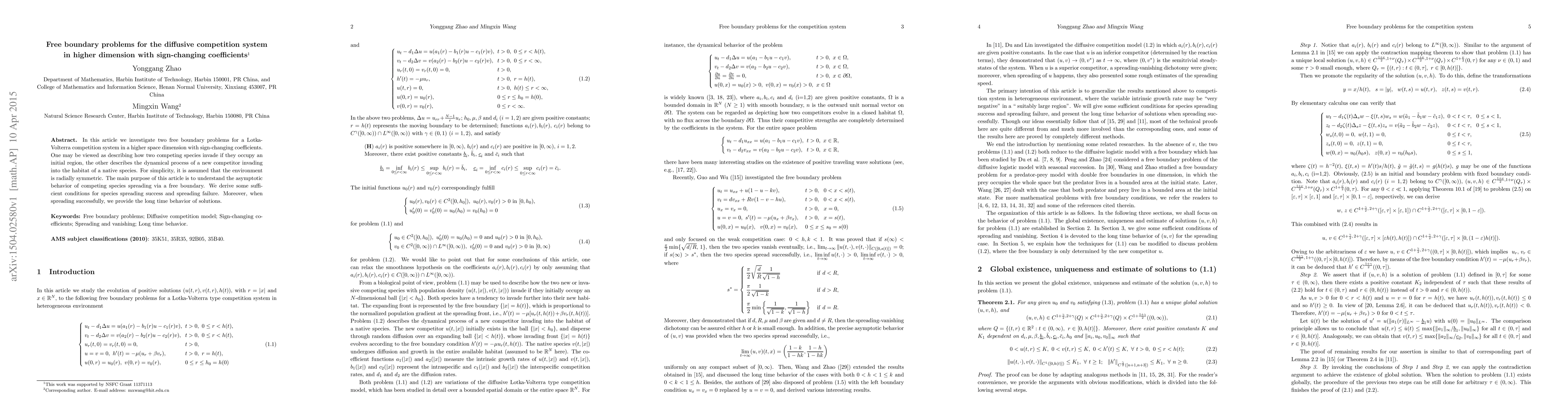 In this article we investigate two free boundary problems for a Lotka-Volterra competition system in a higher space dimension with sign-changing coefficients. One may be viewed as describing how two competing species invade if they occupy an initial region, the other describes the dynamical process of a new competitor invading into the habitat of a native species. For simplicity, it is assumed that the environment is radially symmetric. The main purpose of this article is to understand the asymptotic behavior of competing species spreading via a free boundary. We derive some sufficient conditions for species spreading success and spreading failure. Moreover, when spreading successfully, we provide the long time behavior of solutions.