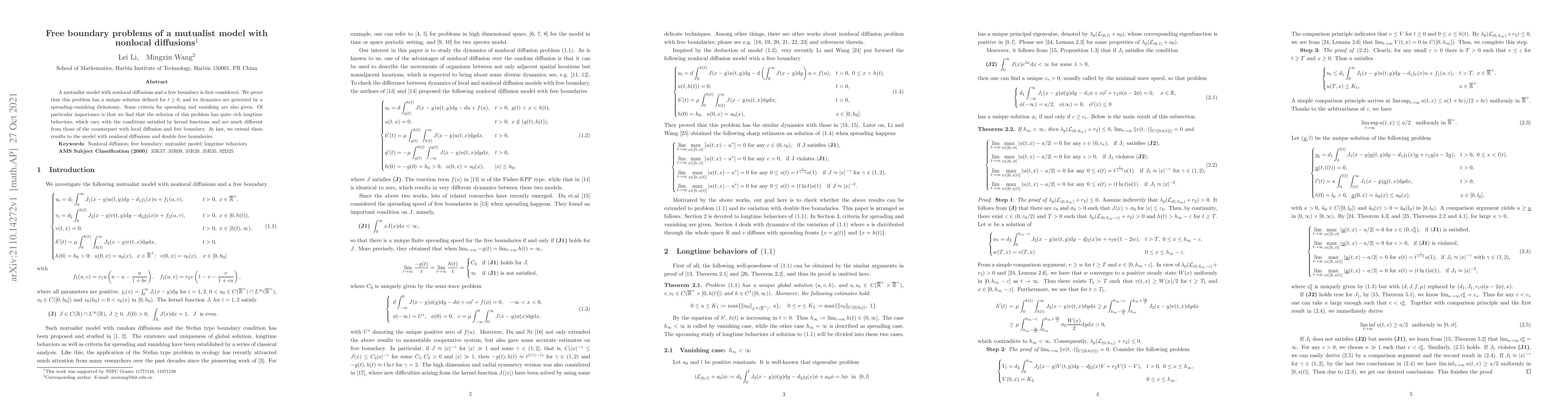 This paper explores a mutualist model with nonlocal diffusions and a free boundary, proving the existence of a unique solution governed by spreading-vanishing dynamics. It reveals distinct long-term behaviors compared to the local diffusion model, and extends findings to a model with double free boundaries.