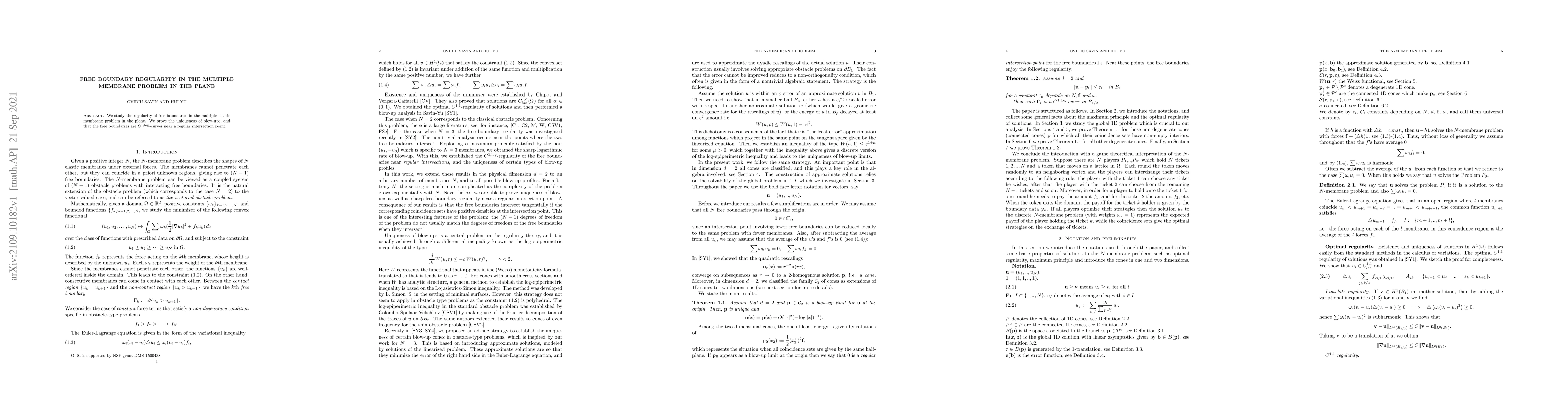 We study the regularity of free boundaries in the multiple elastic membrane problem in the plane. We prove the uniqueness of blow-ups, and that the free boundaries are $C^{1,\log}$-curves near a regular intersection point.