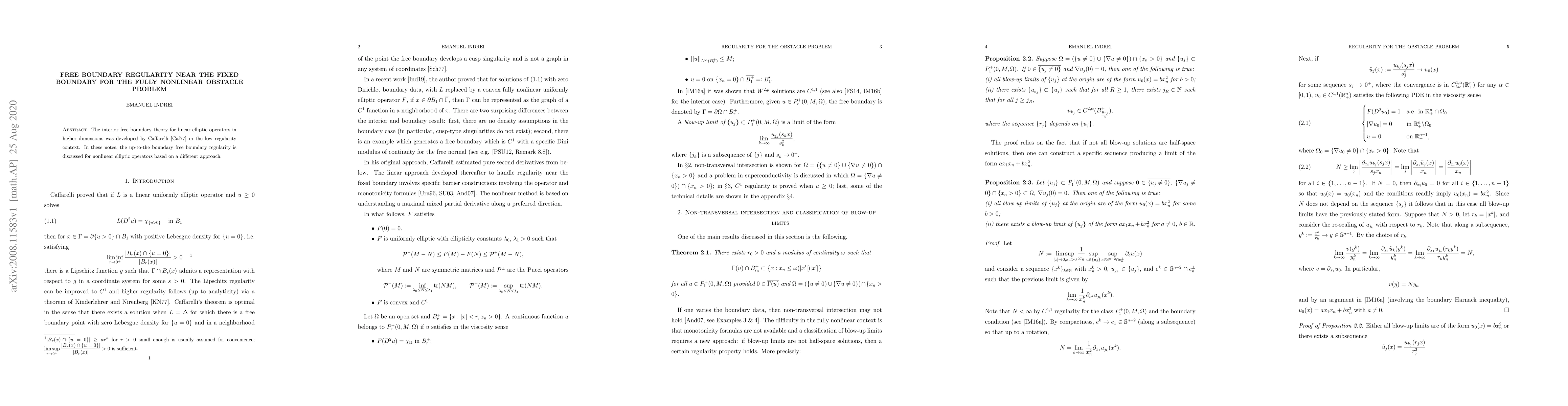 The interior free boundary theory for linear elliptic operators in higher dimensions was developed by Caffarelli in the low regularity context. In these notes, the up-to-the boundary free boundary regularity is discussed for nonlinear elliptic operators based on a different approach.