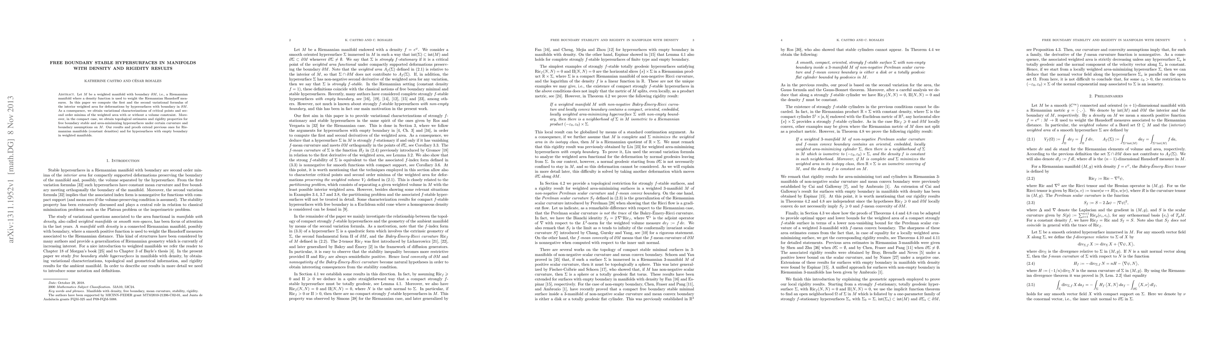 This paper studies free boundary stable hypersurfaces in weighted manifolds, deriving first and second variational formulas for the weighted area. It establishes variational characterizations for critical points and second order minima, and provides topological estimates and rigidity results for such hypersurfaces under specific curvature and boundary conditions.