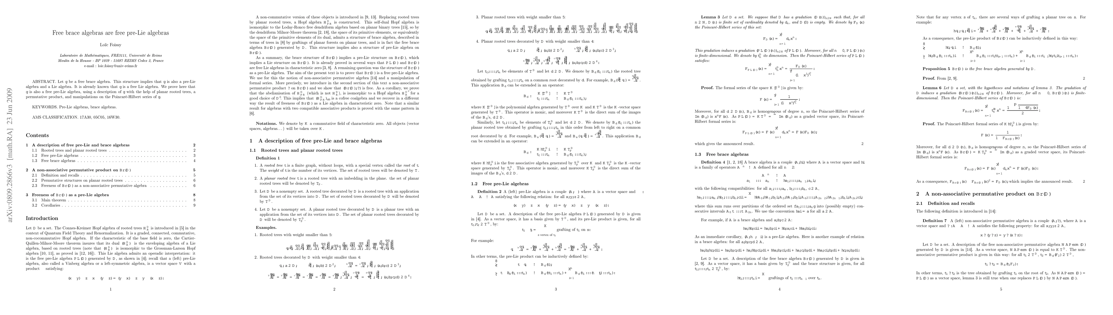 Let g be a free brace algebra. This structure implies that g is also a prelie algebra and a Lie algebra. It is already known that g is a free Lie algebra. We prove here that g is also a free prelie algebra, using a description of g with the help of planar rooted trees, a permutative product, and anipulations on the Poincar\'e-Hilbert series of g.