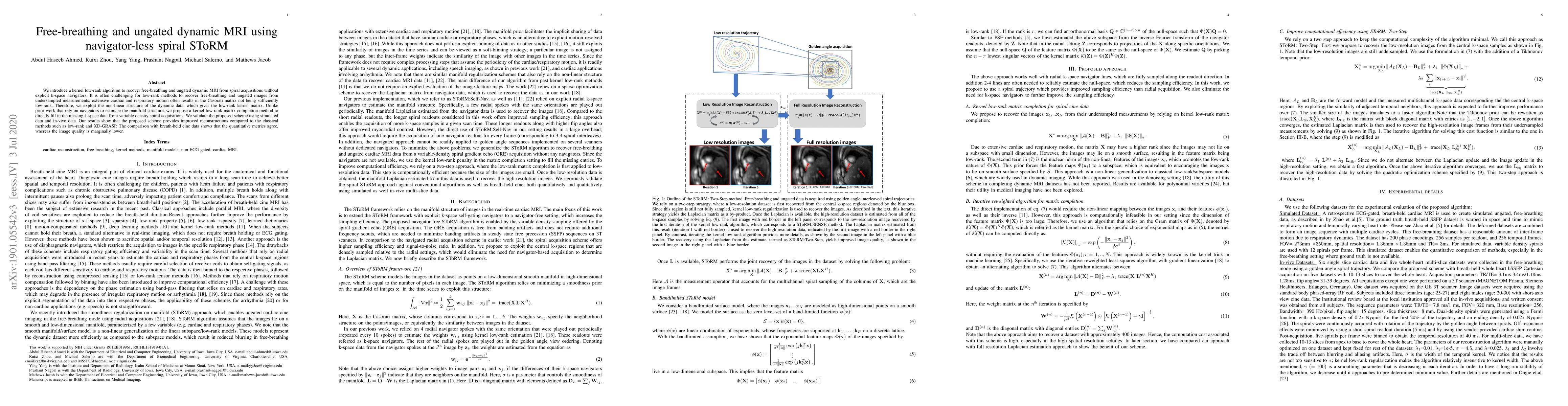 This paper introduces a kernel low-rank algorithm for reconstructing free-breathing and ungated cardiac MRI using spiral acquisitions without navigators. The method leverages the non-linear structure of dynamic data to complete the low-rank matrix, providing improved reconstructions compared to classical methods.