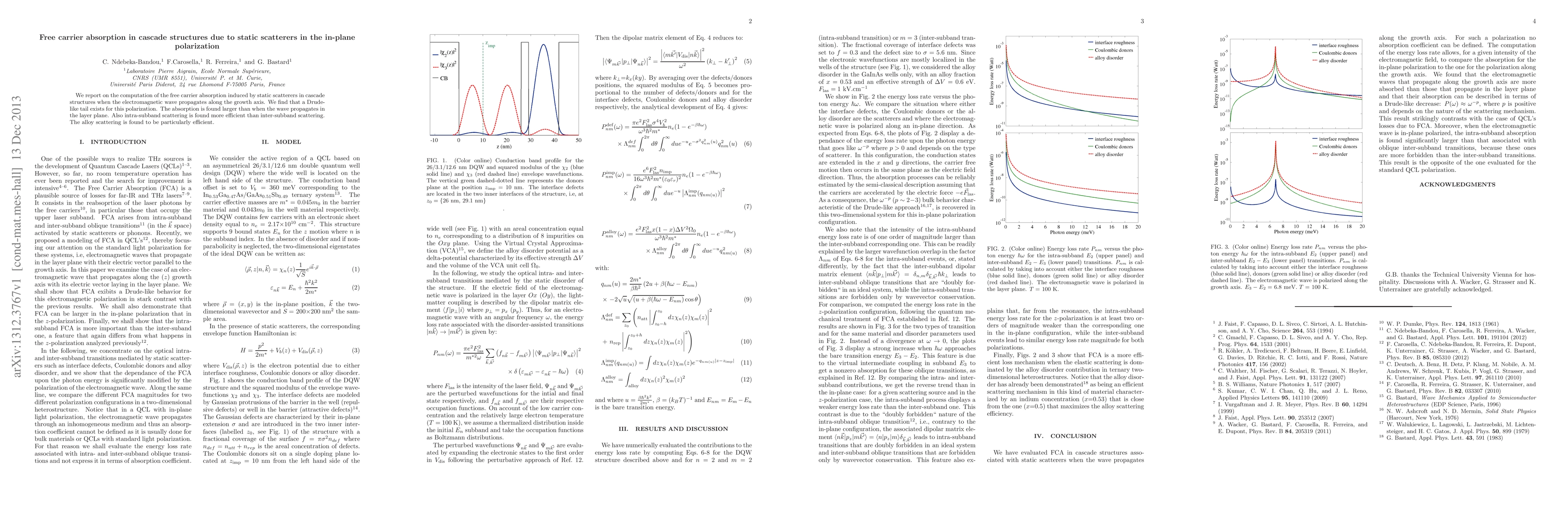 This study investigates free carrier absorption in cascade structures due to static scatterers with in-plane polarization, revealing a Drude-like tail and higher absorption compared to layer plane propagation. Intra-subband scattering is more efficient than inter-subband scattering, with alloy scattering being particularly effective.