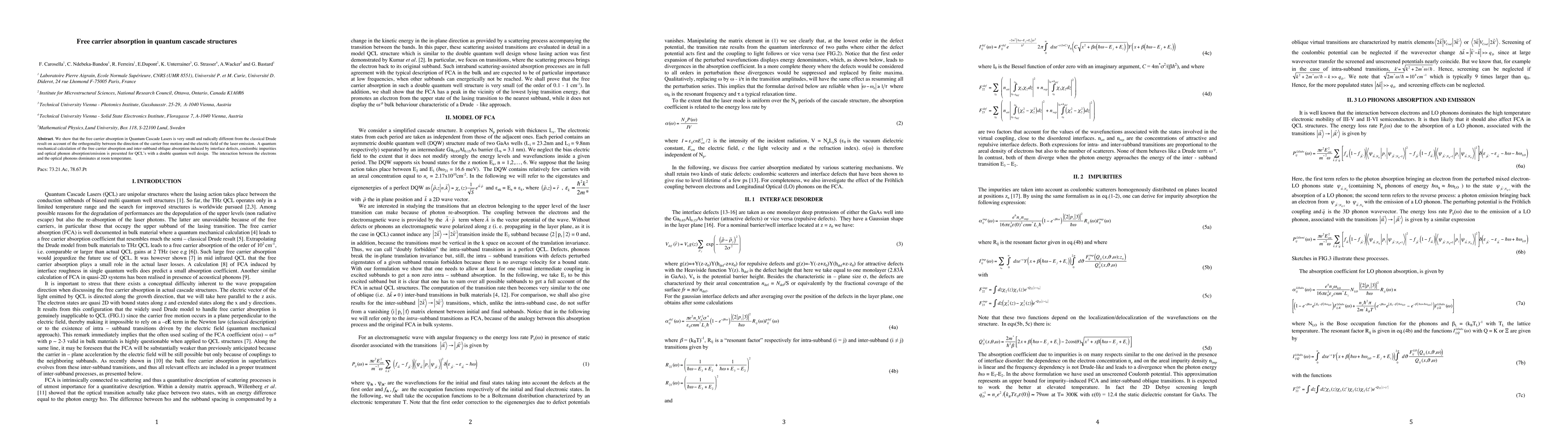 The paper presents a comprehensive quantum mechanical formulation for calculating FCA and inter-subband absorption in QCLs, incorporating interface defects, ionized impurities, and electron-LO phonon interactions.