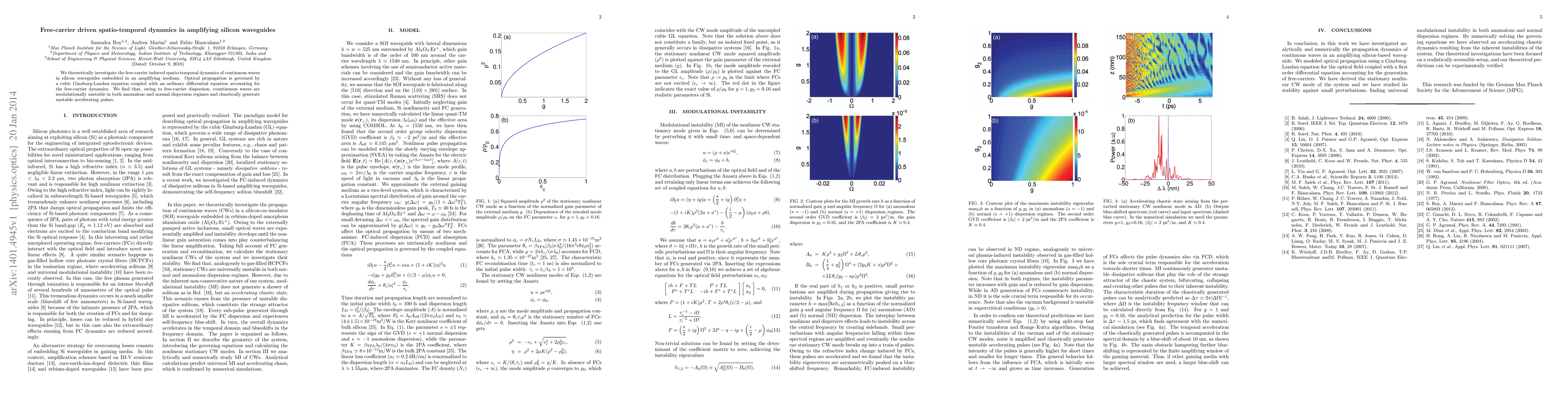 We theoretically investigate the free-carrier induced spatio-temporal dynamics of continuous waves in silicon waveguides embedded in an amplifying medium. Optical propagation is governed by a cubic Ginzburg-Landau equation coupled with an ordinary differential equation accounting for the free-carrier dynamics. We find that, owing to free-carrier dispersion, countinuous waves are modulationally unstable in both anomalous and normal dispersion regimes and chaotically generate unstable accelerating pulses.