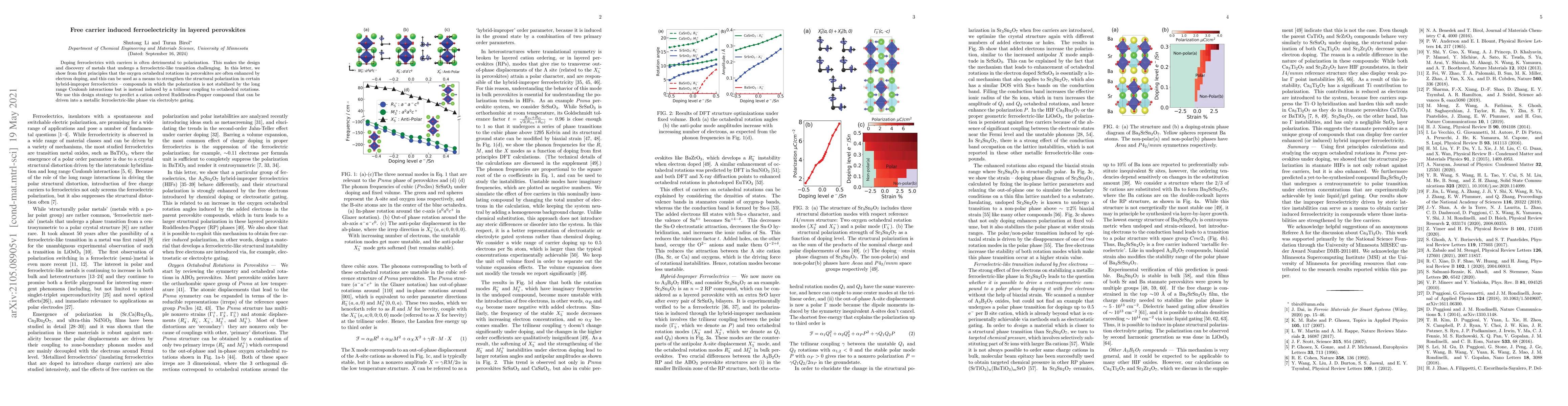 This paper demonstrates that electron doping can enhance oxygen octahedral rotations in perovskites, thereby strengthening structural polarization in hybrid-improper ferroelectrics. The authors predict a cation-ordered Ruddlesden-Popper compound that can transition to a metallic ferroelectric-like phase through electrolyte gating.