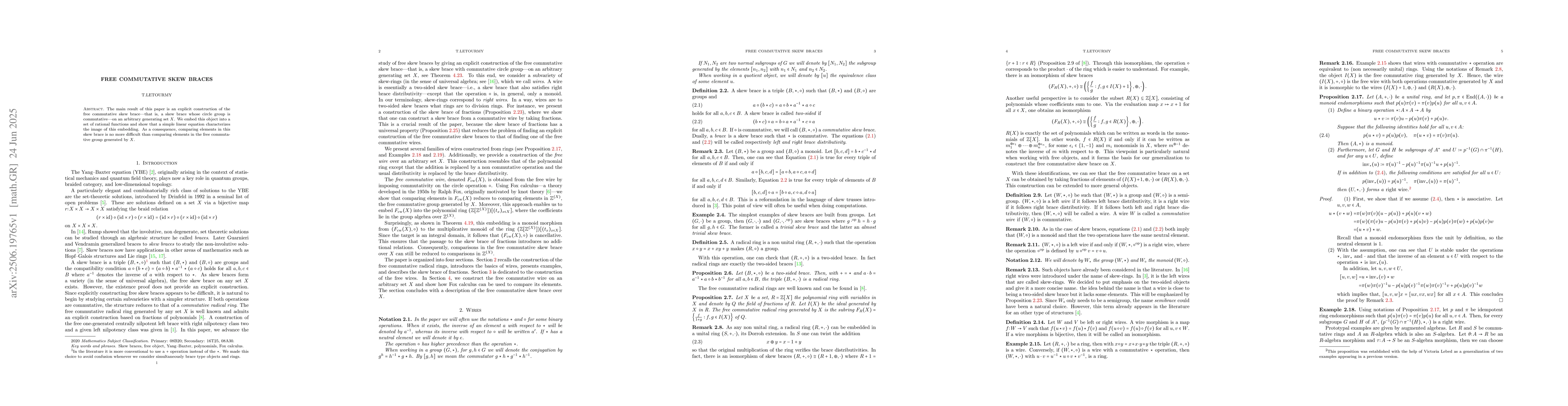The main result of this paper is an explicit construction of the free commutative skew brace -- that is, a skew brace whose circle group is commutative -- on an arbitrary generating set $X$. We embed this object into a set of rational functions and show that a simple linear equation characterizes the image of this embedding. As a consequence, comparing elements in this skew brace is no more difficult than comparing elements in the free commutative group generated by $X$.