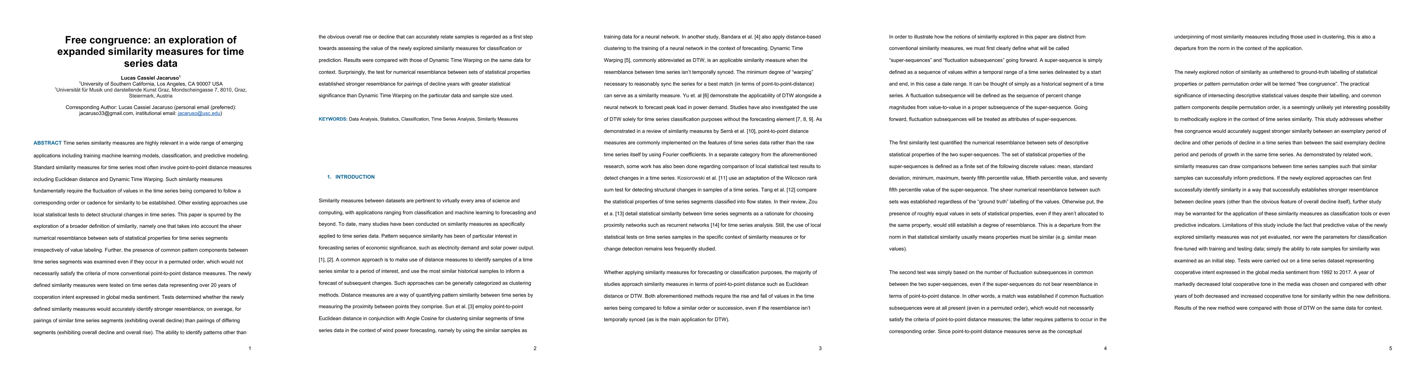 This paper explores an expanded similarity measure for time series data that focuses on numerical resemblance between statistical properties rather than point-to-point distances, demonstrating stronger similarity for decline years compared to Dynamic Time Warping. The method identifies common pattern components regardless of order, offering a broader definition of time series similarity.