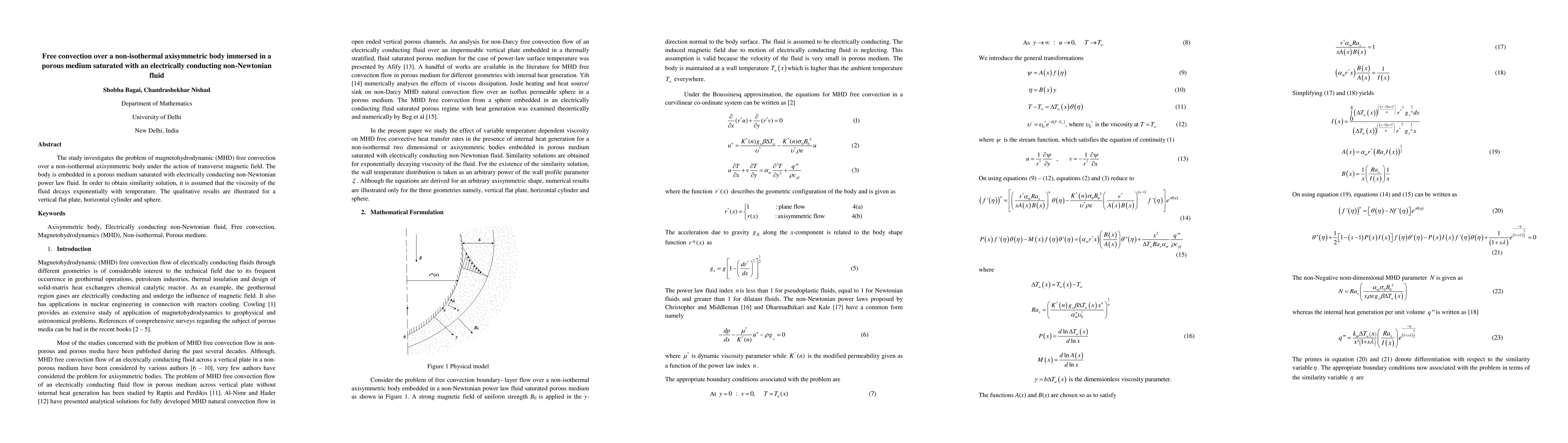 This paper examines magnetohydrodynamic free convection over non-isothermal axisymmetric bodies in a porous medium filled with electrically conducting non-Newtonian fluid. It provides a similarity solution for scenarios involving a vertical flat plate, horizontal cylinder, and sphere under a transverse magnetic field.