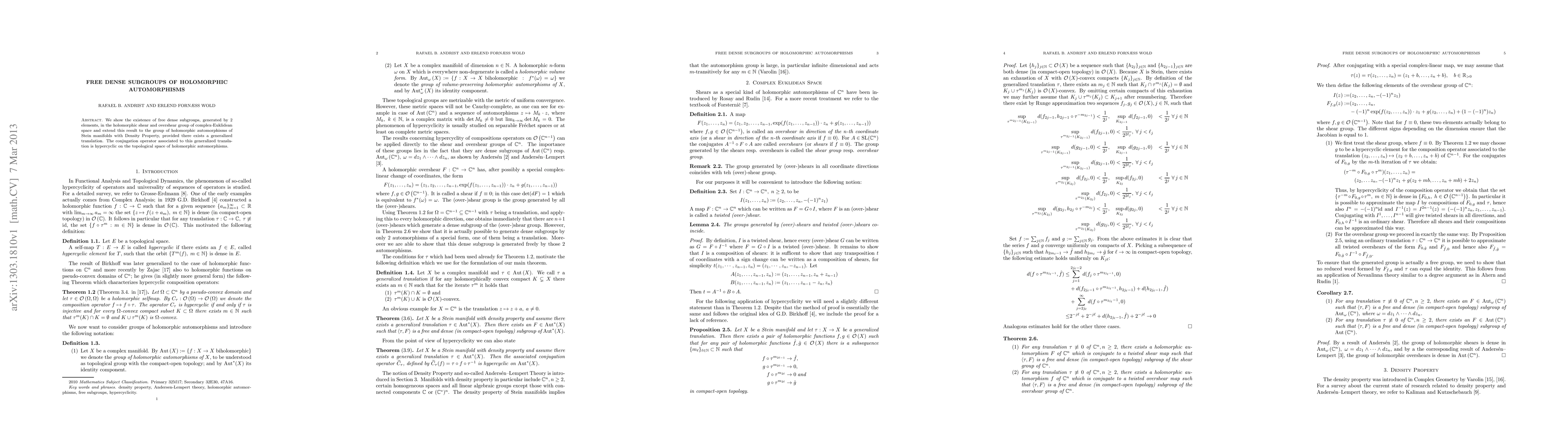 Summary: The paper demonstrates the existence of 2-element generated free dense subgroups within holomorphic shear and overshear groups in complex-Euklidean space, extending this to Stein manifolds with Density Property, contingent on a hypercyclic conjugation operator from generalized translation.