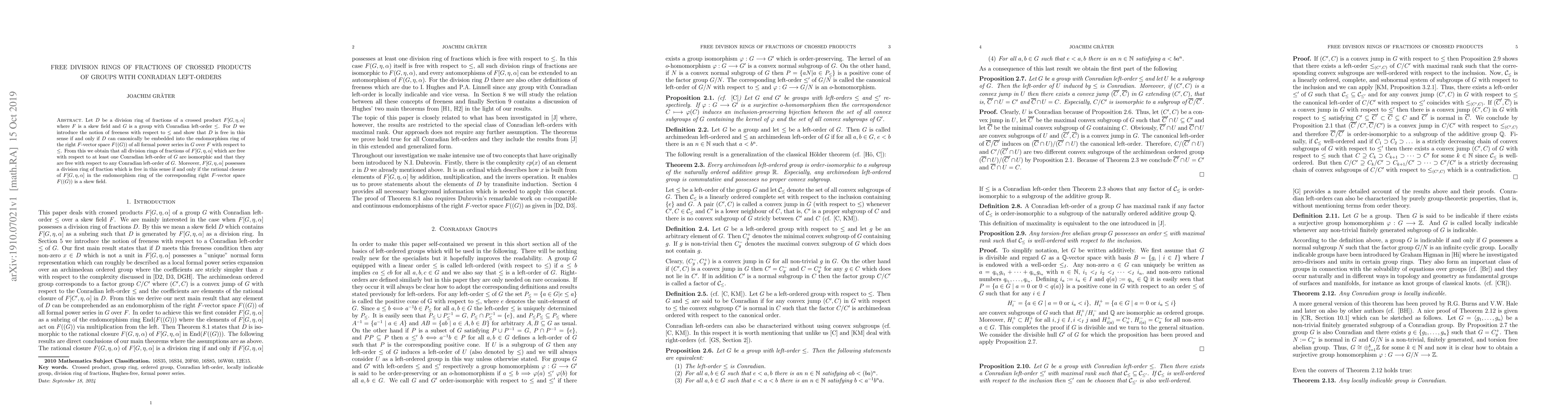 Let $D$ be a division ring of fractions of a crossed product $F[G,\eta,\alpha]$ where $F$ is a skew field and $G$ is a group with Conradian left-order $\leq$. For $D$ we introduce the notion of freeness with respect to $\leq$ and show that $D$ is free in this sense if and only if $D$ can canonically be embedded into the endomorphism ring of the right $F$-vector space $F((G))$ of all formal power series in $G$ over $F$ with respect to $\leq$. From this we obtain that all division rings of fractions of $F[G,\eta,\alpha]$ which are free with respect to at least one Conradian left-order of $G$ are isomorphic and that they are free with respect to any Conradian left-order of $G$. Moreover, $F[G,\eta,\alpha]$ possesses a division ring of fraction which is free in this sense if and only if the rational closure of $F[G,\eta,\alpha]$ in the endomorphism ring of the corresponding right $F$-vector space $F((G))$ is a skew field.