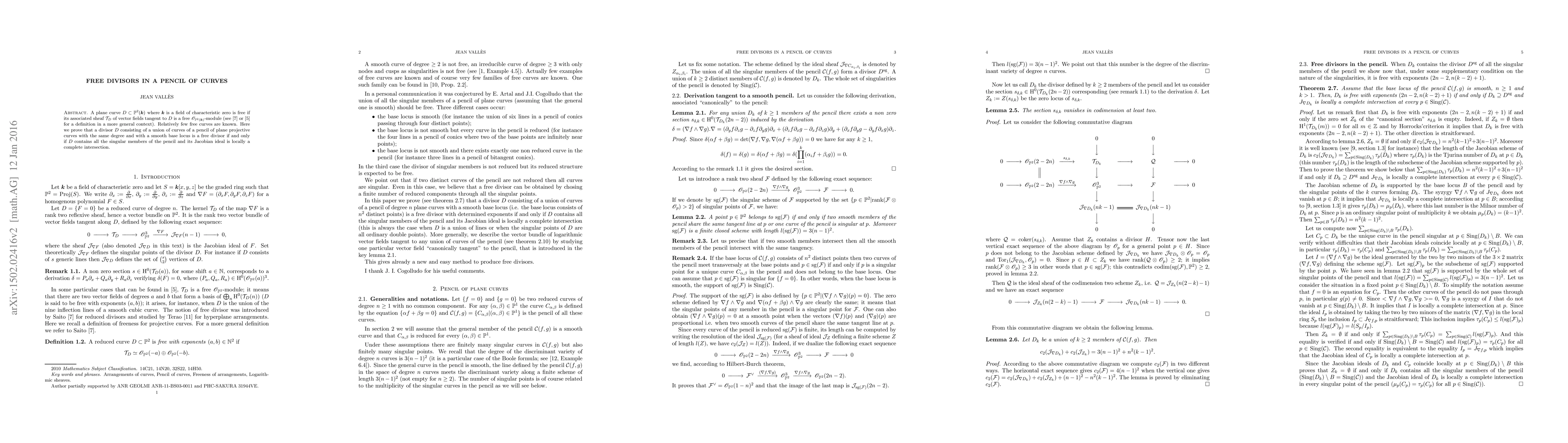 A plane curve on a the projective space over a field of characteristic zero is free if its associated sheaf T of tangent vector fields tangent is a free module. Relatively few free curves are known. Here we prove that a divisor consisting of a union of curves of a pencil of plane projective curves with the same degree and with a smooth base locus is a free divisor if and only this union contains all the singular members of the pencil and its Jacobian ideal is locally a complete intersection.