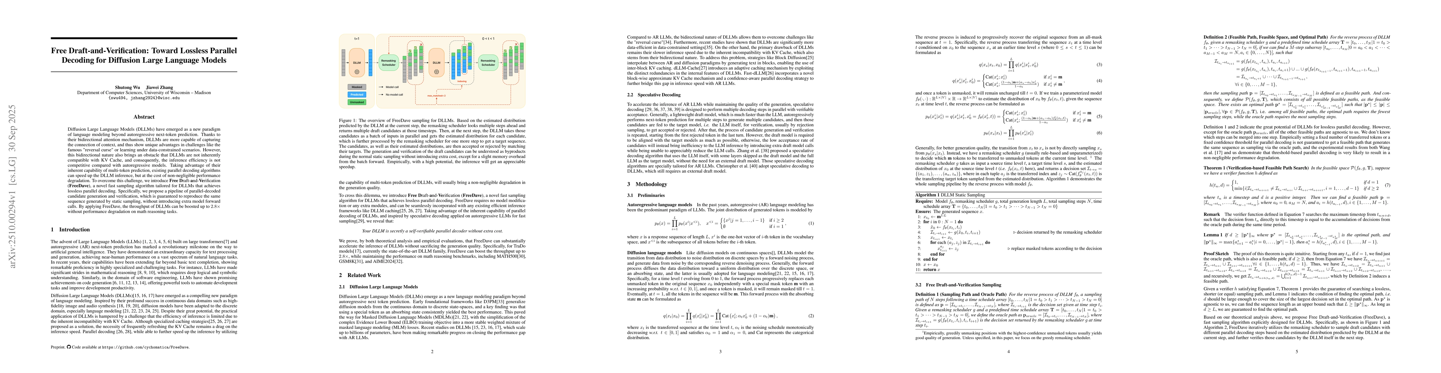 The paper introduces FreeDraft-and-Verification (FreeDave), a novel sampling algorithm for diffusion large language models (DLLMs) that enables lossless parallel decoding. It combines theoretical analysis with empirical evaluations on math reasoning benchmarks, leveraging a verifier function to ensure generated sequences match static sampling results without additional model calls.