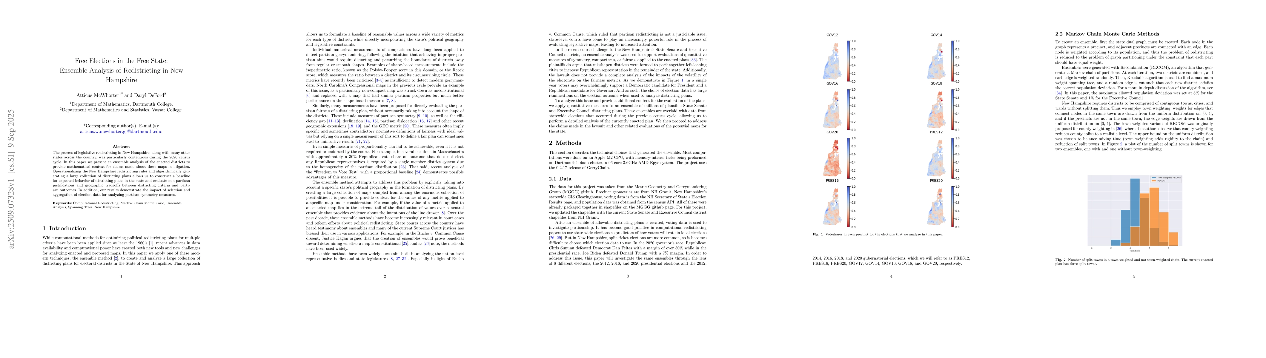 The process of legislative redistricting in New Hampshire, along with many other states across the country, was particularly contentious during the 2020 census cycle. In this paper we present an ensemble analysis of the enacted districts to provide mathematical context for claims made about these maps in litigation. Operationalizing the New Hampshire redistricting rules and algorithmically generating a large collection of districting plans allows us to construct a baseline for expected behavior of districting plans in the state and evaluate non-partisan justifications and geographic tradeoffs between districting criteria and partisan outcomes. In addition, our results demonstrate the impact of selection and aggregation of election data for analyzing partisan symmetry measures.