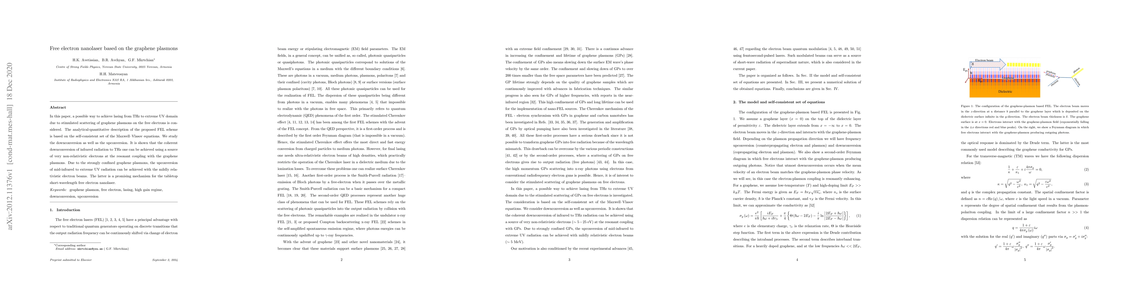 In this paper, a possible way to achieve lasing from THz to extreme UV domain due to stimulated scattering of graphene plasmons on the free electrons is considered. The analytical-quantitative description of the proposed FEL scheme is based on the self-consistent set of the Maxwell--Vlasov equations. We study the downconversion as well as the upconversion. It is shown that the coherent downconversion of infrared radiation to THz one can be achieved using a source of very non-relativistic electrons at the resonant coupling with the graphene plasmons. Due to the strongly confined graphene plasmons, the upconversion of mid-infrared to extreme UV radiation can be achieved with the mildly relativistic electron beams. The latter is a promising mechanism for the tabletop short-wavelength free electron nanolaser.