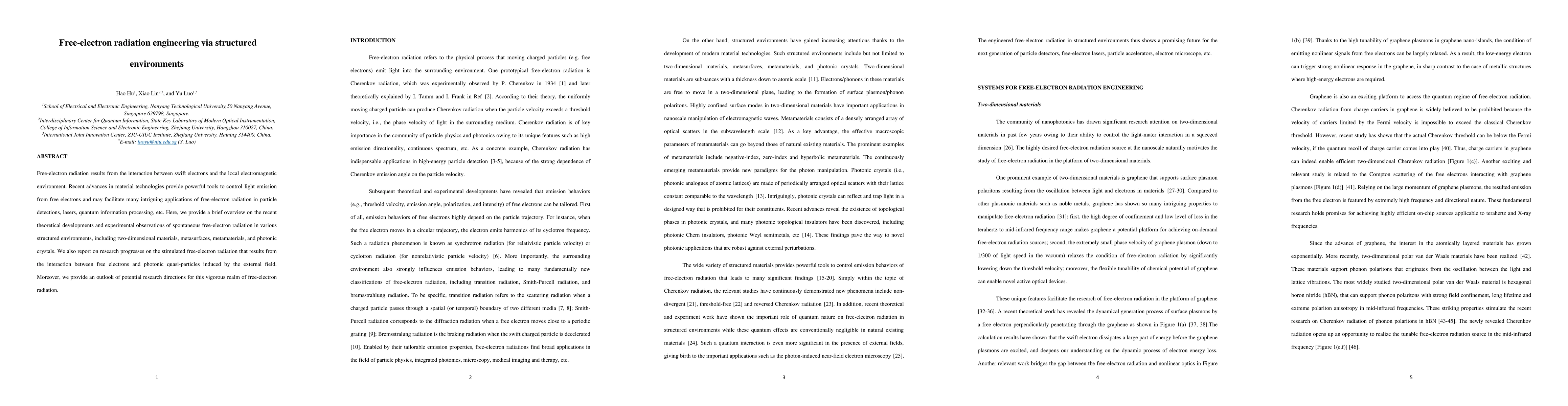 This paper reviews recent theoretical and experimental advancements in controlling free-electron radiation in structured environments like metasurfaces and photonic crystals, highlighting potential applications in particle detection and quantum information processing. It also discusses stimulated radiation and future research directions.