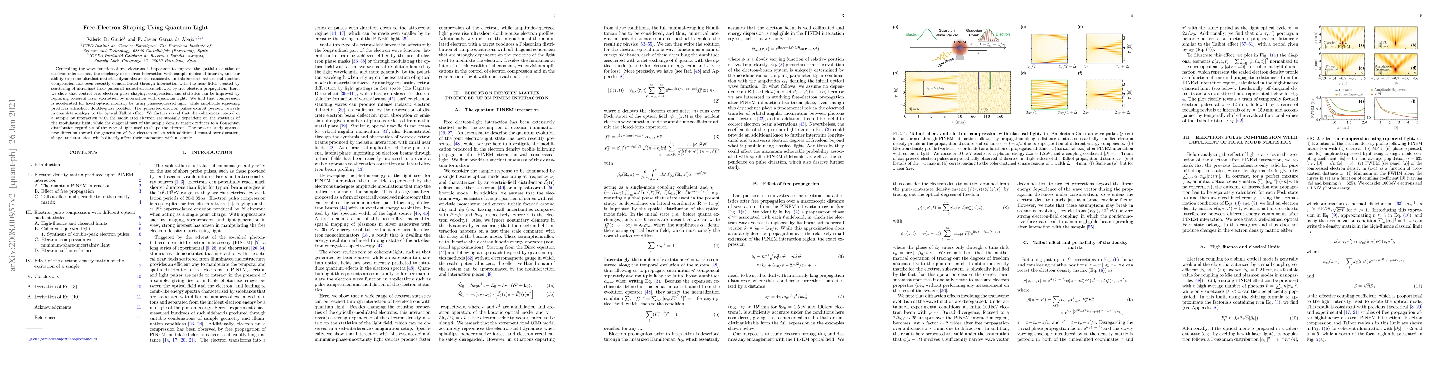 Controlling the wave function of free electrons is important to improve the spatial resolution of electron microscopes, the efficiency of electron interaction with sample modes of interest, and our ability to probe ultrafast materials dynamics at the nanoscale. In this context, attosecond electron compression has been recently demonstrated through interaction with the near fields created by scattering of ultrashort laser pulses at nanostructures followed by free electron propagation. Here, we show that control over electron pulse shaping, compression, and statistics can be improved by replacing coherent laser excitation by interaction with quantum light. We find that compression is accelerated for fixed optical intensity by using phase-squeezed light, while amplitude squeezing produces ultrashort double-pulse profiles. The generated electron pulses exhibit periodic revivals in complete analogy to the optical Talbot effect. We further reveal that the coherences created in a sample by interaction with the modulated electron are strongly dependent on the statistics of the modulating light, while the diagonal part of the sample density matrix reduces to a Poissonian distribution regardless of the type of light used to shape the electron. The present study opens a new direction toward the generation of free electron pulses with additional control over duration, shape, and statistics, which directly affect their interaction with a sample.