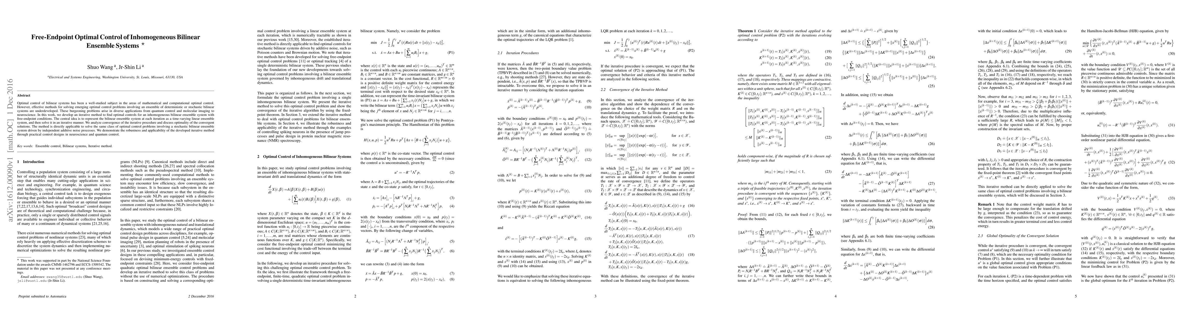 This paper develops an iterative method for solving optimal control problems in inhomogeneous bilinear ensemble systems with free-endpoint conditions. The method represents the ensemble system as a time-varying linear system iteratively and analyzes its convergence and optimality, demonstrating its application in neuroscience and quantum control.