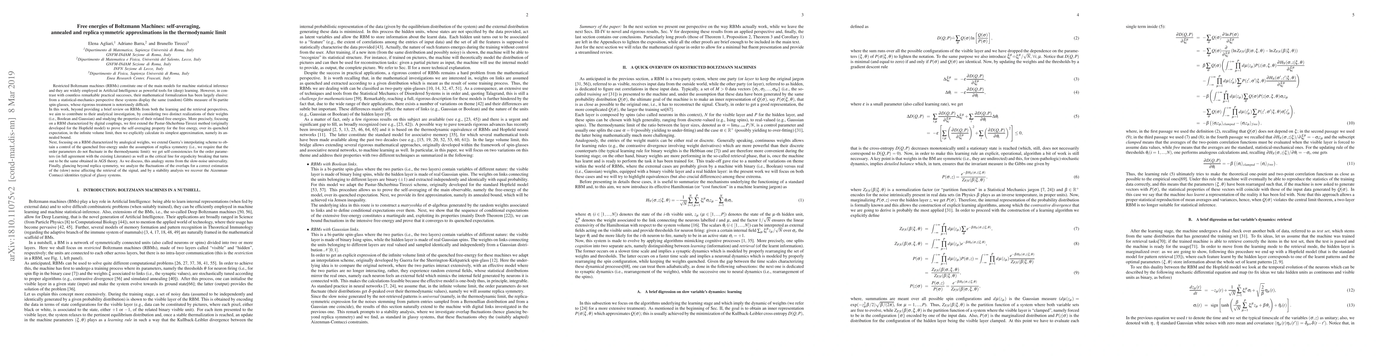 Restricted Boltzmann machines (RBMs) constitute one of the main models for machine statistical inference and they are widely employed in Artificial Intelligence as powerful tools for (deep) learning. However, in contrast with countless remarkable practical successes, their mathematical formalization has been largely elusive: from a statistical-mechanics perspective these systems display the same (random) Gibbs measure of bi-partite spin-glasses, whose rigorous treatment is notoriously difficult. In this work, beyond providing a brief review on RBMs from both the learning and the retrieval perspectives, we aim to contribute to their analytical investigation, by considering two distinct realizations of their weights (i.e., Boolean and Gaussian) and studying the properties of their related free energies. More precisely, focusing on a RBM characterized by digital couplings, we first extend the Pastur-Shcherbina-Tirozzi method (originally developed for the Hopfield model) to prove the self-averaging property for the free energy, over its quenched expectation, in the infinite volume limit, then we explicitly calculate its simplest approximation, namely its annealed bound. Next, focusing on a RBM characterized by analogical weights, we extend Guerra's interpolating scheme to obtain a control of the quenched free-energy under the assumption of replica symmetry: we get self-consistencies for the order parameters (in full agreement with the existing Literature) as well as the critical line for ergodicity breaking that turns out to be the same obtained in AGS theory. As we discuss, this analogy stems from the slow-noise universality. Finally, glancing beyond replica symmetry, we analyze the fluctuations of the overlaps for an estimate of the (slow) noise affecting the retrieval of the signal, and by a stability analysis we recover the Aizenman-Contucci identities typical of glassy systems.