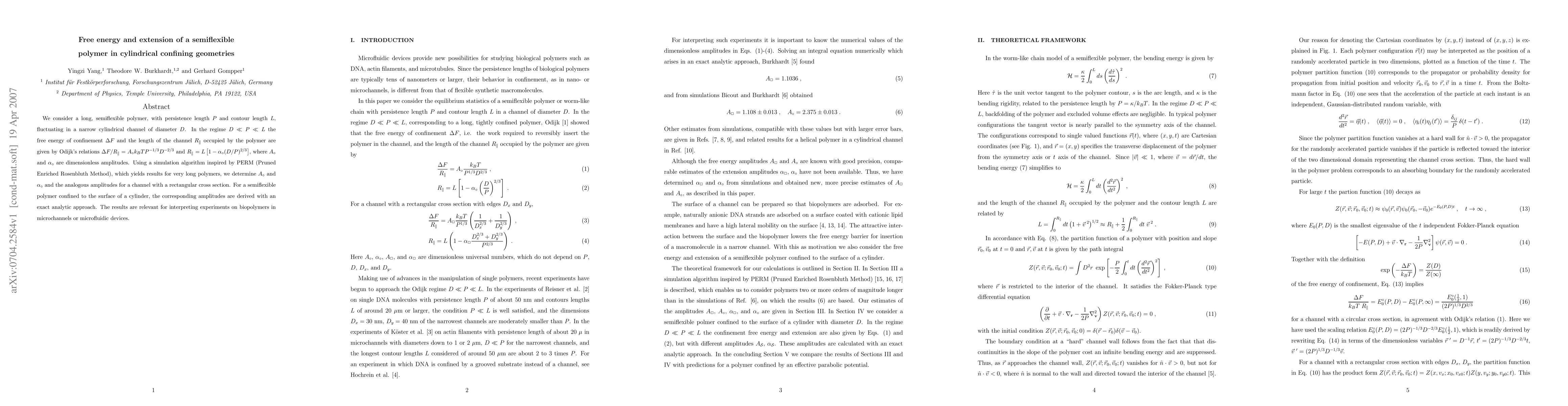 This paper investigates the free energy and extension of semiflexible polymers confined within cylindrical geometries, deriving Odijk's relations for free energy and channel occupation length. Using a simulation method and an exact analytic approach, it determines the dimensionless amplitudes for cylindrical and rectangular channels, relevant for understanding biopolymer behavior in microfluidic devices.