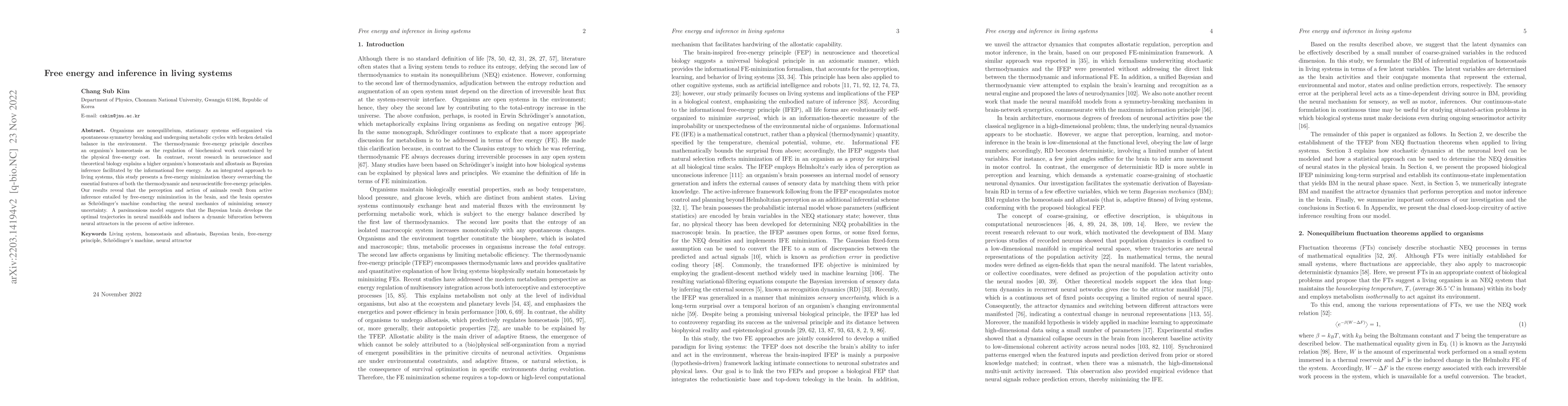 The study applies the free energy principle (FEP) to living systems, integrating thermodynamic and Bayesian perspectives to describe an organism's homeostasis and allostasis as Bayesian inference facilitated by the informational free energy. A free-energy minimization theory is proposed to overarch essential features of both thermodynamic and neuroscientific FEPs.