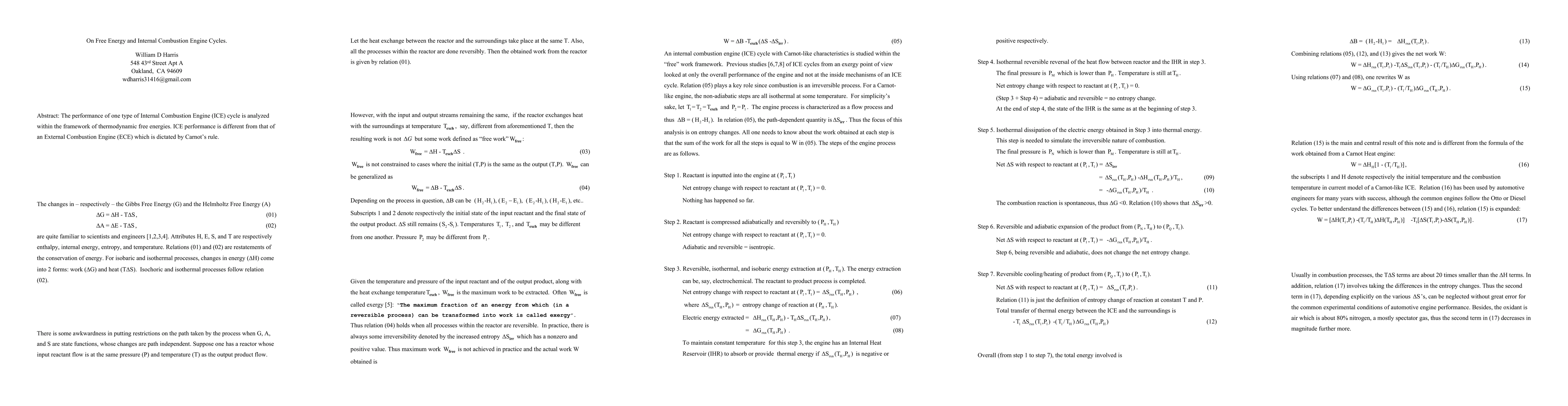 The performance of one type (Carnot) of Internal Combustion Engine (ICE) cycle is analyzed within the framework of thermodynamic free energies. ICE performance is different from that of an External Combustion Engine (ECE) which is dictated by Carnot's rule.