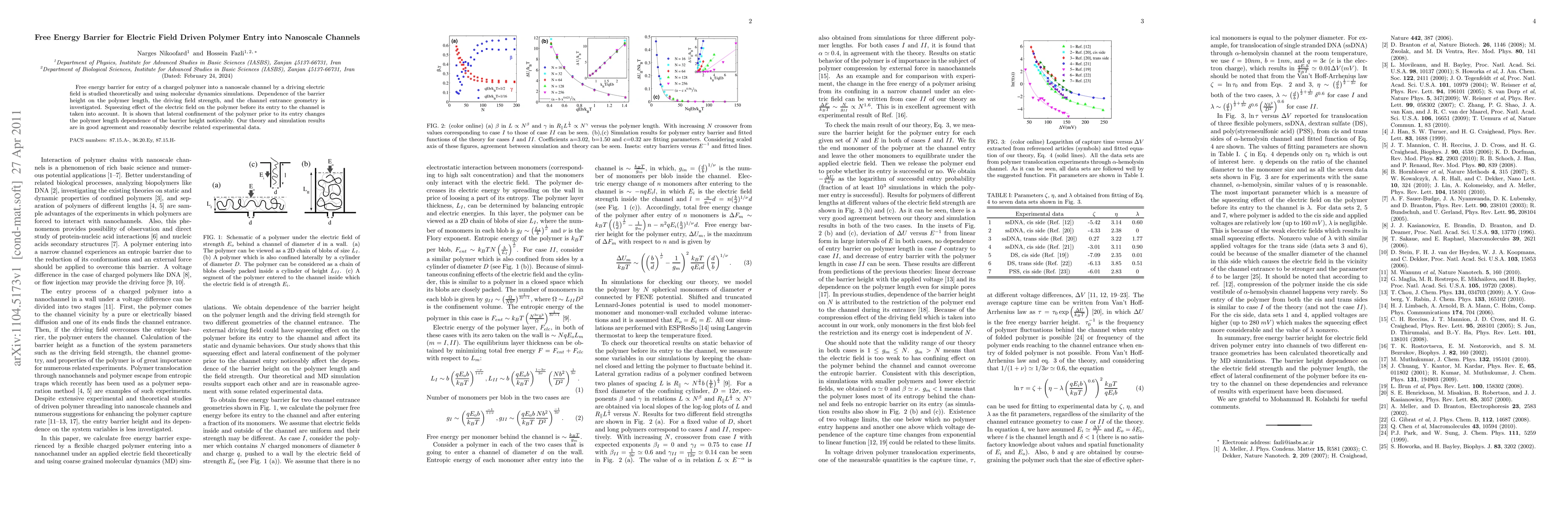 Free energy barrier for entry of a charged polymer into a nanoscale channel by a driving electric field is studied theoretically and using molecular dynamics simulations. Dependence of the barrier height on the polymer length, the driving field strength, and the channel entrance geometry is investigated. Squeezing effect of the electric field on the polymer before its entry to the channel is taken into account. It is shown that lateral confinement of the polymer prior to its entry changes the polymer length dependence of the barrier height noticeably. Our theory and simulation results are in good agreement and reasonably describe related experimental data.
