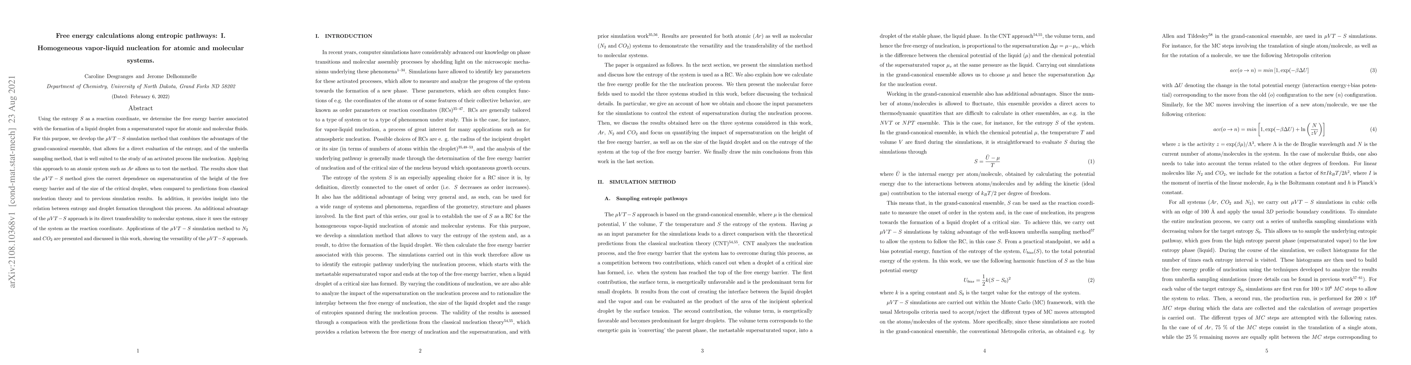 Using the entropy $S$ as a reaction coordinate, we determine the free energy barrier associated with the formation of a liquid droplet from a supersaturated vapor for atomic and molecular fluids. For this purpose, we develop the $\mu VT-S$ simulation method that combines the advantages of the grand-canonical ensemble, that allows for a direct evaluation of the entropy, and of the umbrella sampling method, that is well suited to the study of an activated process like nucleation. Applying this approach to an atomic system such as $Ar$ allows us to test the method. The results show that the $\mu VT-S$ method gives the correct dependence on supersaturation of the height of the free energy barrier and of the size of the critical droplet, when compared to predictions from classical nucleation theory and to previous simulation results. In addition, it provides insight into the relation between entropy and droplet formation throughout this process. An additional advantage of the $\mu VT-S$ approach is its direct transferability to molecular systems, since it uses the entropy of the system as the reaction coordinate. Applications of the $\mu VT-S$ simulation method to $N_2$ and $CO_2$ are presented and discussed in this work, showing the versatility of the $\mu VT-S$ approach.