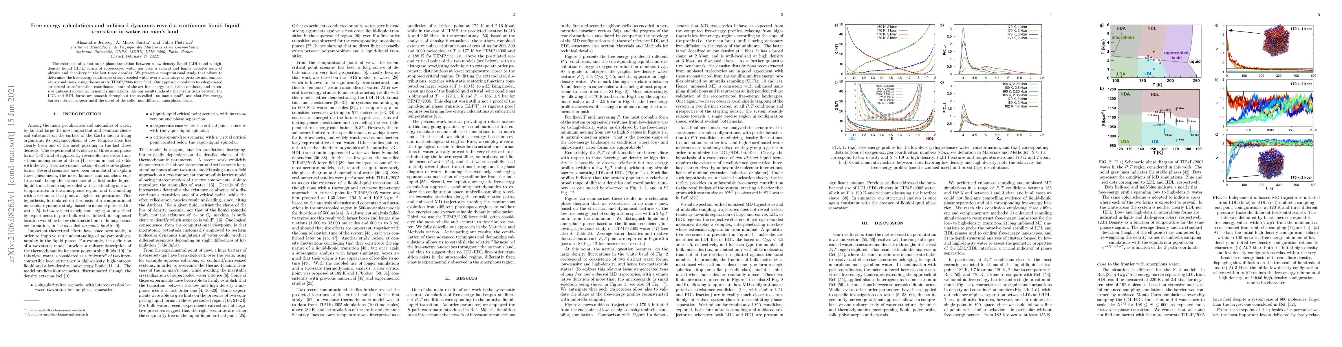 This study reveals that supercooled water undergoes a continuous liquid-liquid transition without a first-order phase transition between low-density liquid (LDL) and high-density liquid (HDL) forms, based on free energy calculations and unbiased molecular dynamics simulations. The findings suggest that free-energy barriers emerge only when transitioning to solid, non-diffusive amorphous forms.