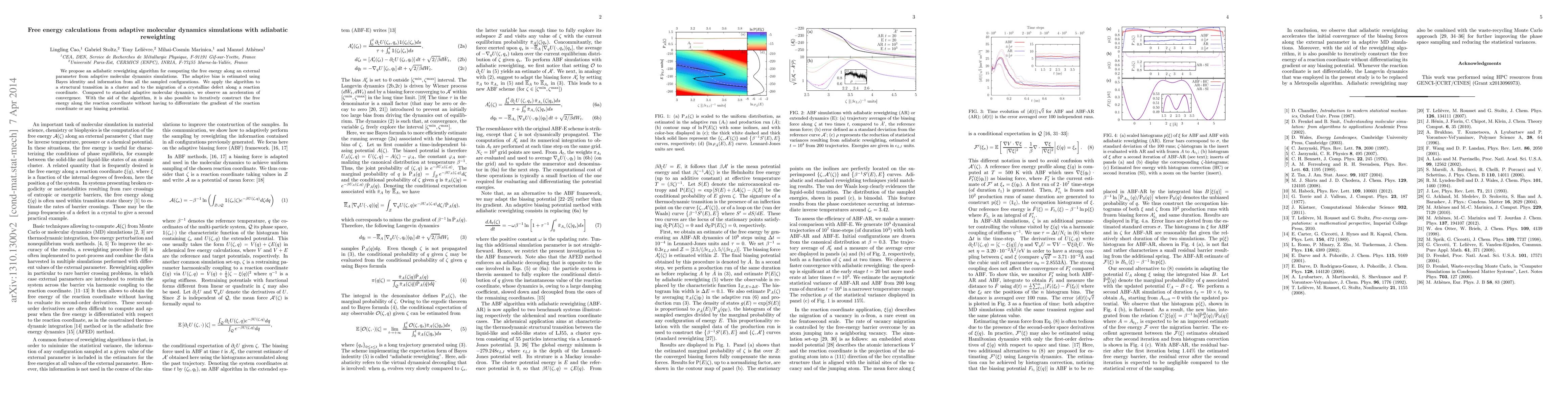This paper introduces an adiabatic reweighting algorithm for calculating free energy from adaptive molecular dynamics simulations, showing improved convergence compared to standard methods. The algorithm iteratively constructs free energy profiles without requiring gradient differentiation, demonstrated through applications to structural transitions and defect migration.