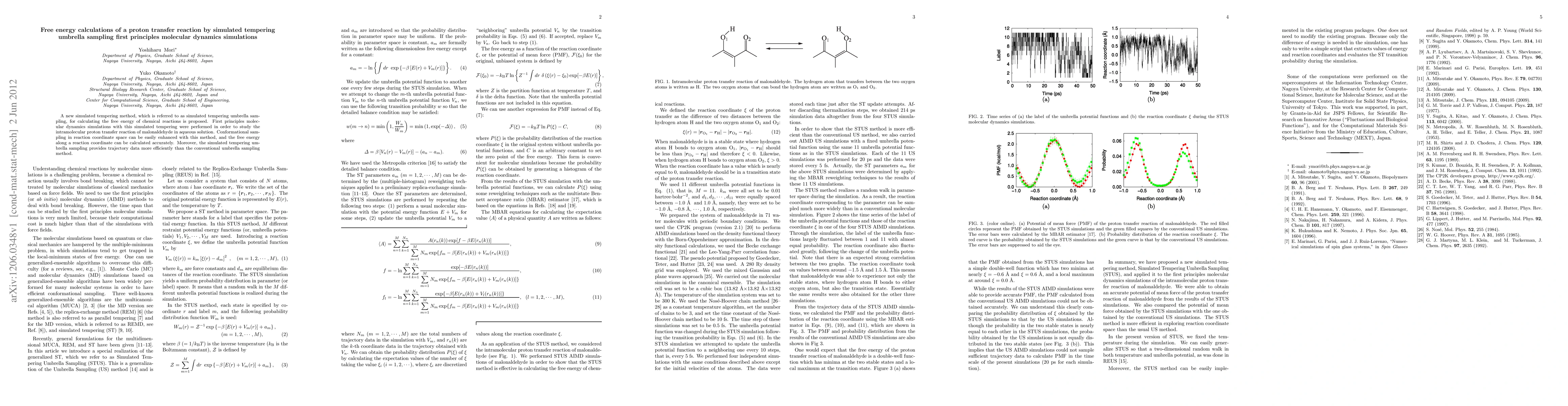 This paper proposes a novel simulated tempering umbrella sampling method for calculating free energy in chemical reactions, applying it to study the proton transfer reaction in malonaldehyde in aqueous solution. The method enhances conformational sampling and provides more efficient trajectory data compared to conventional umbrella sampling.