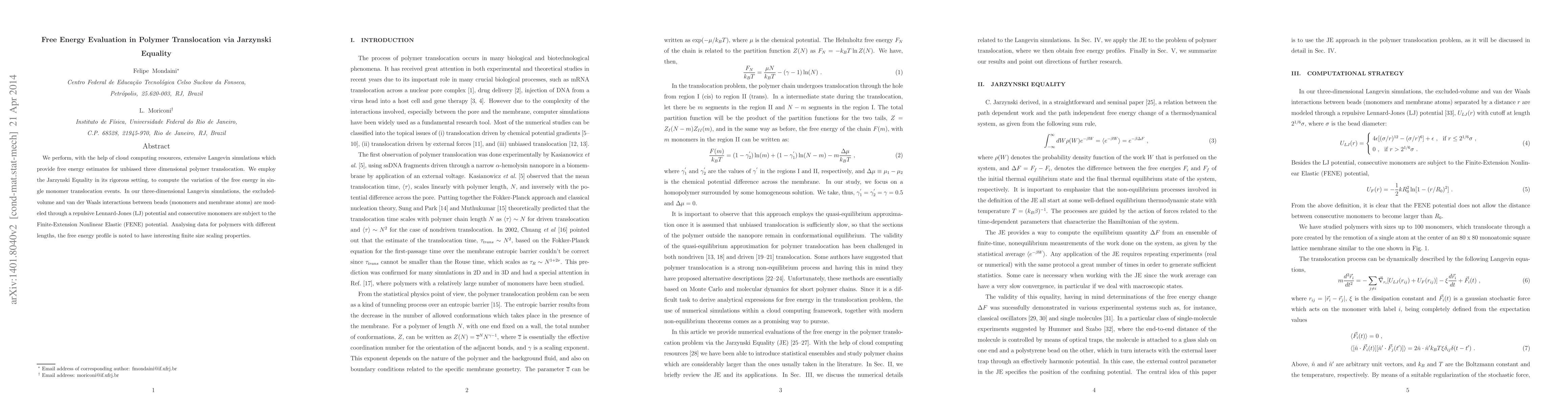 We perform, with the help of cloud computing resources, extensive Langevin simulations which provide free energy estimates for unbiased three dimensional polymer translocation. We employ the Jarzynski equality in its rigorous setting, to compute the variation of the free energy in single monomer translocation events. In our three-dimensional Langevin simulations, the excluded-volume and van der Waals interactions between beads (monomers and membrane atoms) are modeled through a repulsive Lennard-Jones (LJ) potential and consecutive monomers are subject to the Finite-Extension Nonlinear Elastic (FENE) potential. Analysing data for polymers with different lengths, the free energy profile is noted to have interesting finite size scaling properties.