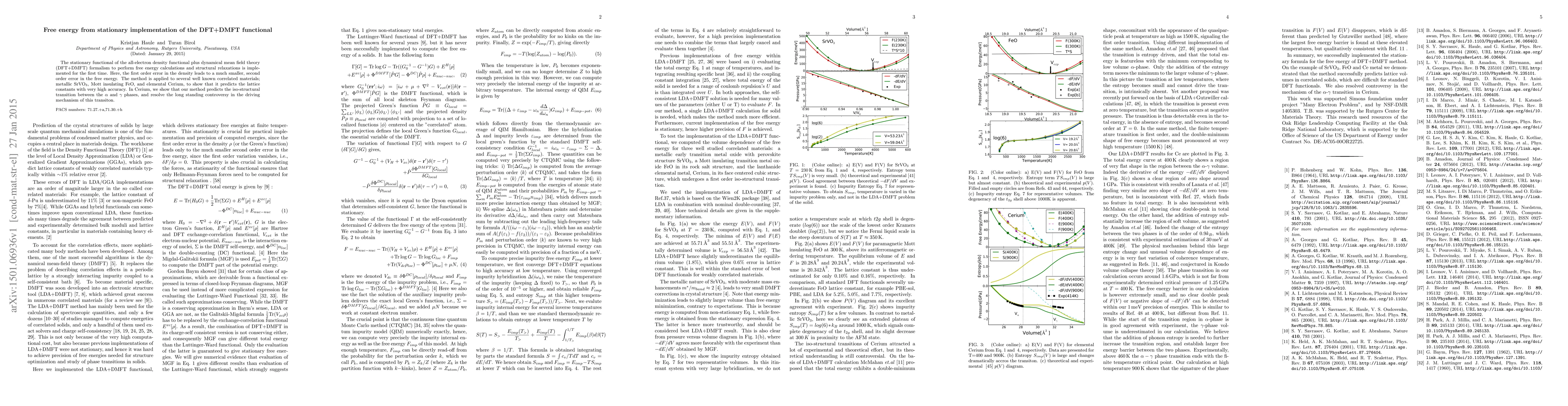 The stationary functional of the all-electron density functional plus dynamical mean field theory (DFT+DMFT) formalism to perform free energy calculations and structural relaxations is implemented for the first time. Here, the first order error in the density leads to a much smaller, second order error in the free energy. The method is applied to several well known correlated materials; metallic SrVO$_3$, Mott insulating FeO, and elemental Cerium, to show that it predicts the lattice constants with very high accuracy. In Cerium, we show that our method predicts the iso-structural transition between the $\alpha$ and $\gamma$ phases, and resolve the long standing controversy in the driving mechanism of this transition.