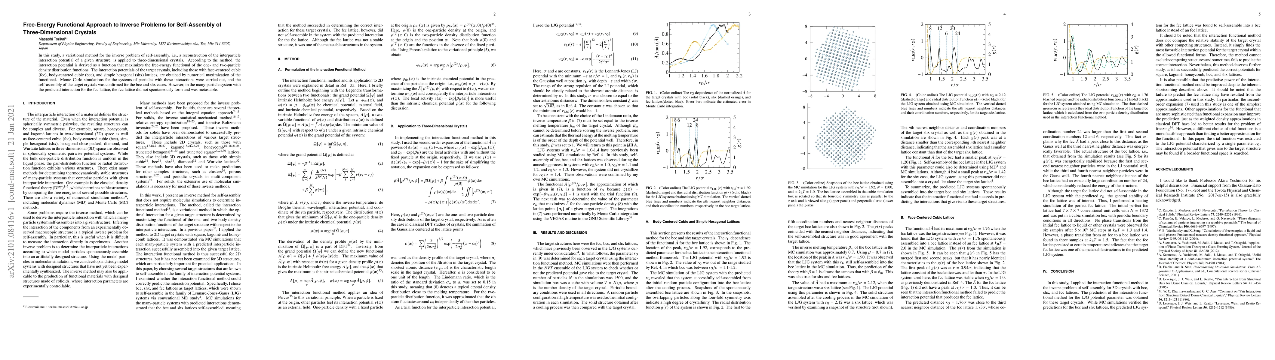 This study applies a variational method to reconstruct the interparticle interaction potentials for three-dimensional crystals, deriving potentials for fcc, bcc, and shx lattices via free-energy functional maximization. While bcc and shx lattices self-assembled as predicted, the fcc lattice remained metastable.
