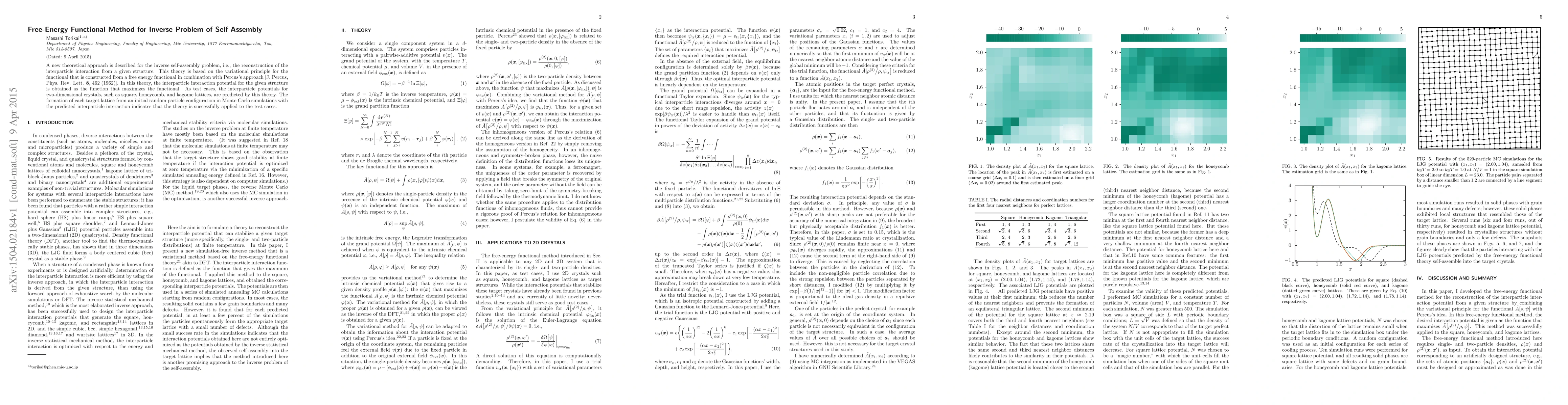 This paper introduces a new theoretical method for reconstructing interparticle interactions from given self-assembly structures using a free-energy functional and Percus's approach. The method successfully predicts interaction potentials for two-dimensional crystals, validated by Monte Carlo simulations.