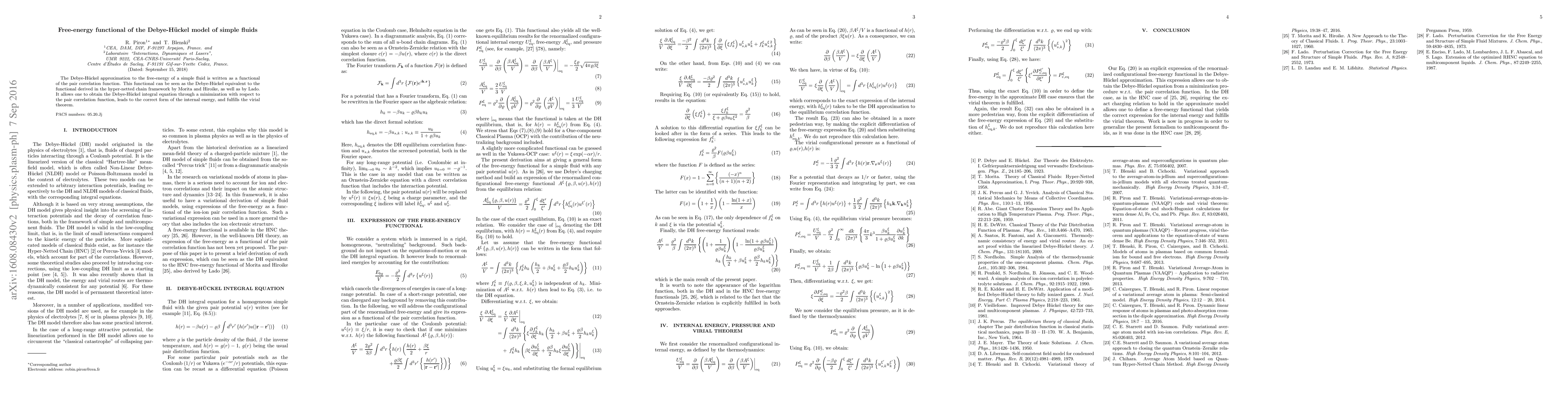 The Debye-Hückel model's free-energy functional is expressed in terms of the pair correlation function, enabling derivation of the Debye-Hückel integral equation via minimization, and ensuring compliance with the internal energy and virial theorem.