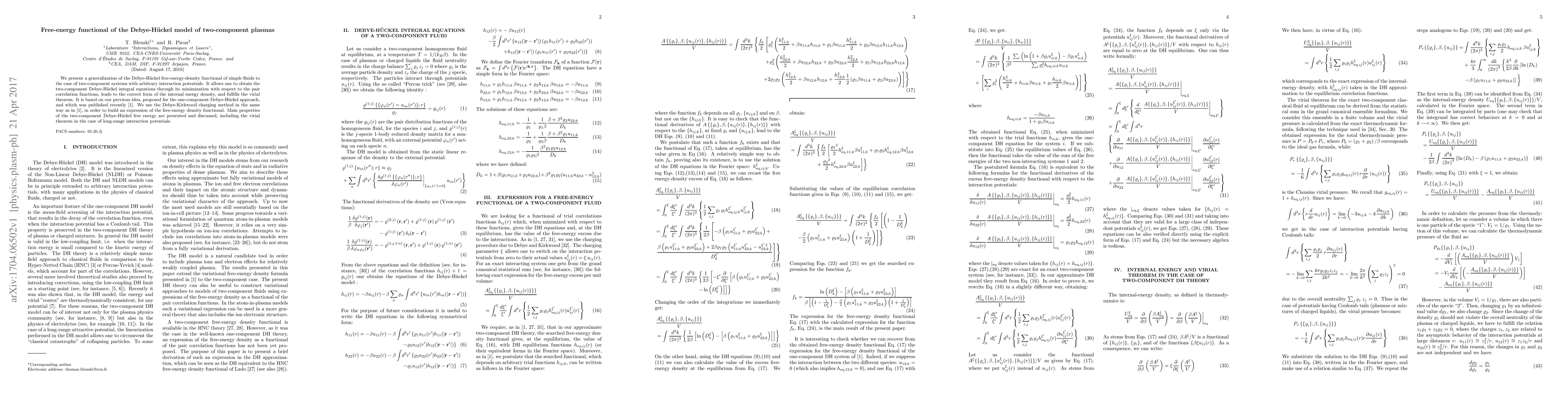 We present a generalization of the Debye-H\"uckel free-energy-density functional of simple fluids to the case of two-component systems with arbitrary interaction potentials. It allows one to obtain the two-component Debye-H\"uckel integral equations through its minimization with respect to the pair correlation functions, leads to the correct form of the internal energy density, and fulfills the virial theorem. It is based on our previous idea, proposed for the one-component Debye-H\"uckel approach, and which was published recently \cite{Piron16}. We use the Debye-Kirkwood charging method in the same way as in \cite{Piron16}, in order to build an expression of the free-energy density functional. Main properties of the two-component Debye-H\"uckel free energy are presented and discussed, including the virial theorem in the case of long-range interaction potentials.