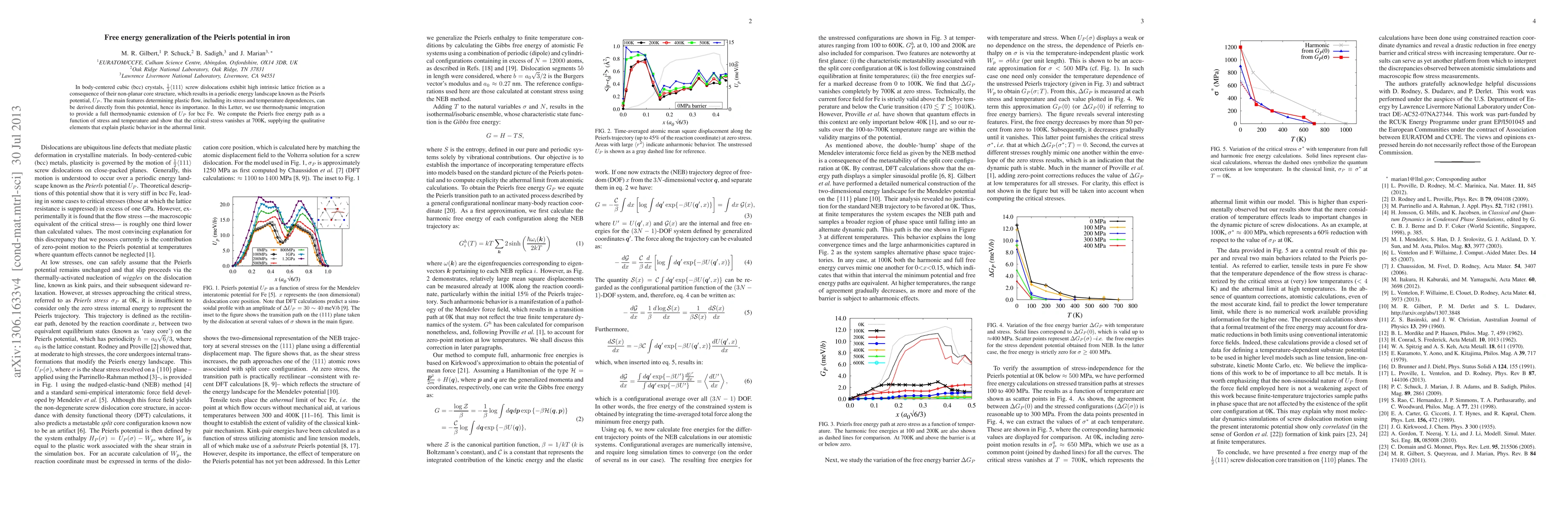In body-centered cubic (bcc) crystals, ${1}{2}111$ screw dislocations exhibit high intrinsic lattice friction as a consequence of their non-planar core structure, which results in a periodic energy landscape known as the Peierls potential, $U_P$. The main features determining plastic flow, including its stress and temperature dependences, can be derived directly from this potential, hence its importance. In this Letter, we use thermodynamic integration to provide a full thermodynamic extension of $U_P$ for bcc Fe. We compute the Peierls free energy path as a function of stress and temperature and show that the critical stress vanishes at 700K, supplying the qualitative elements that explain plastic behavior in the athermal limit.