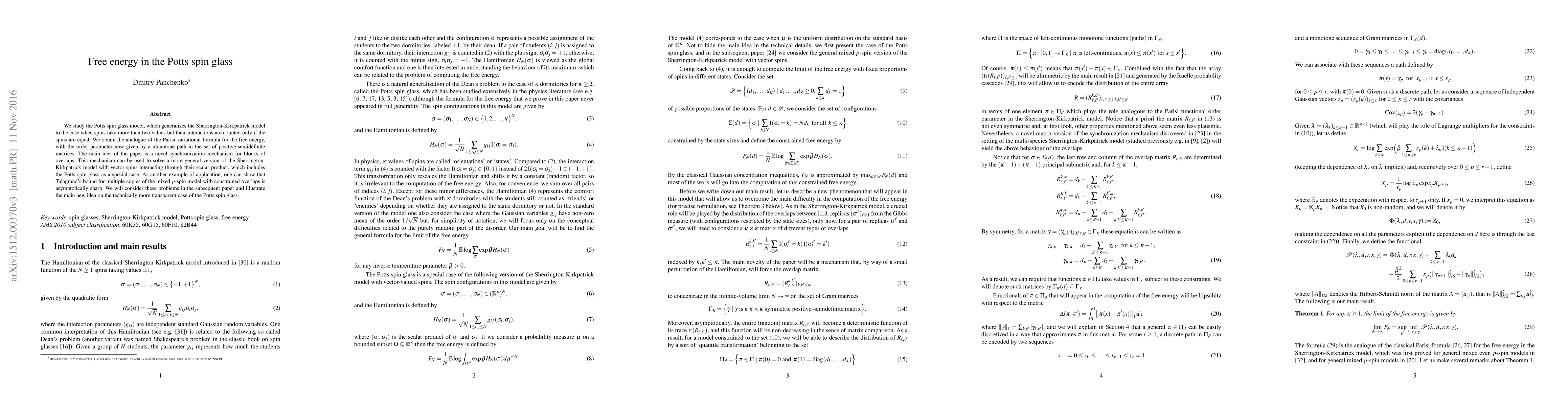 We study the Potts spin glass model, which generalizes the Sherrington-Kirkpatrick model to the case when spins take more than two values but their interactions are counted only if the spins are equal. We obtain the analogue of the Parisi variational formula for the free energy, with the order parameter now given by a monotone path in the set of positive-semidefinite matrices. The main idea of the paper is a novel synchronization mechanism for blocks of overlaps. This mechanism can be used to solve a more general version of the Sherrington-Kirkpatrick model with vector spins interacting through their scalar product, which includes the Potts spin glass as a special case. As another example of application, one can show that Talagrand's bound for multiple copies of the mixed $p$-spin model with constrained overlaps is asymptotically sharp. We consider these problems in the subsequent paper, arXiv:1512.04441, and illustrate the main new idea on the technically more transparent case of the Potts spin glass.