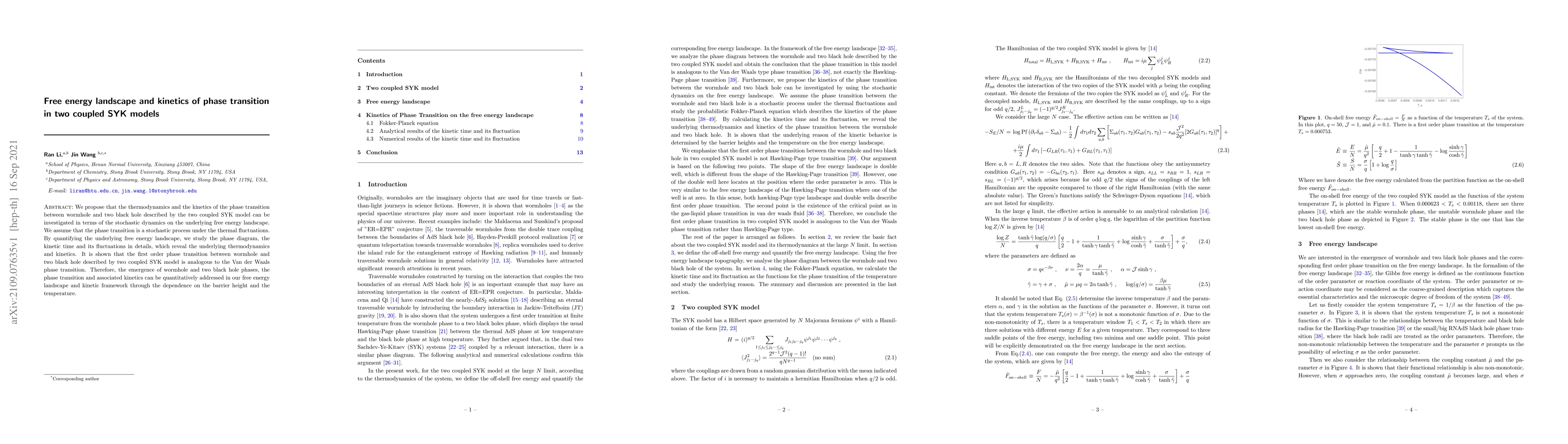 This paper investigates the thermodynamics and kinetics of a phase transition in two coupled SYK models by analyzing the free energy landscape. It finds that the transition between wormhole and two black hole phases behaves similarly to the Van der Waals phase transition, revealing detailed insights into the phase diagram, kinetic time, and associated fluctuations.