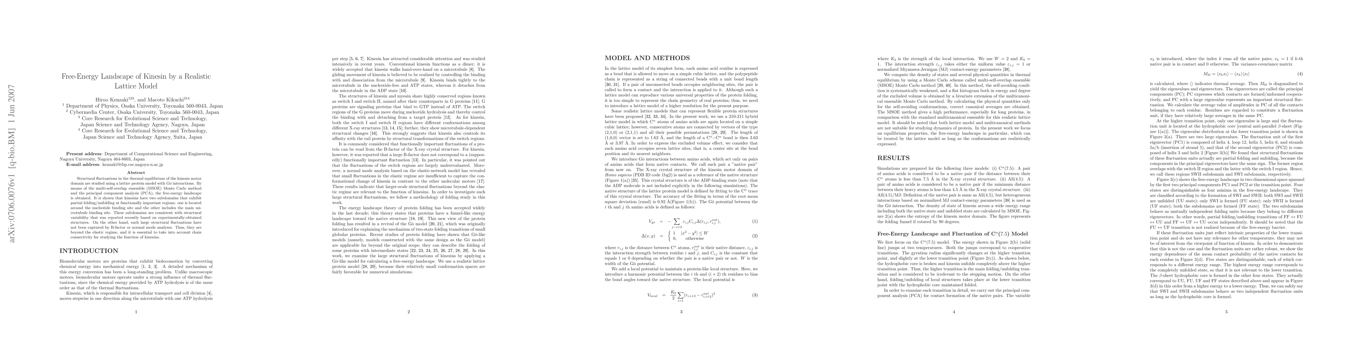 Structural fluctuations in the thermal equilibrium of the kinesin motor domain are studied using a lattice protein model with Go interactions. By means of the multi-self-overlap ensemble (MSOE) Monte Carlo method and the principal component analysis (PCA), the free-energy landscape is obtained. It is shown that kinesins have two subdomains that exhibit partial folding/unfolding at functionally important regions: one is located around the nucleotide binding site and the other includes the main microtubule binding site. These subdomains are consistent with structural variability that was reported recently based on experimentally-obtained structures. On the other hand, such large structural fluctuations have not been captured by B-factor or normal mode analyses. Thus, they are beyond the elastic regime, and it is essential to take into account chain connectivity for studying the function of kinesins.