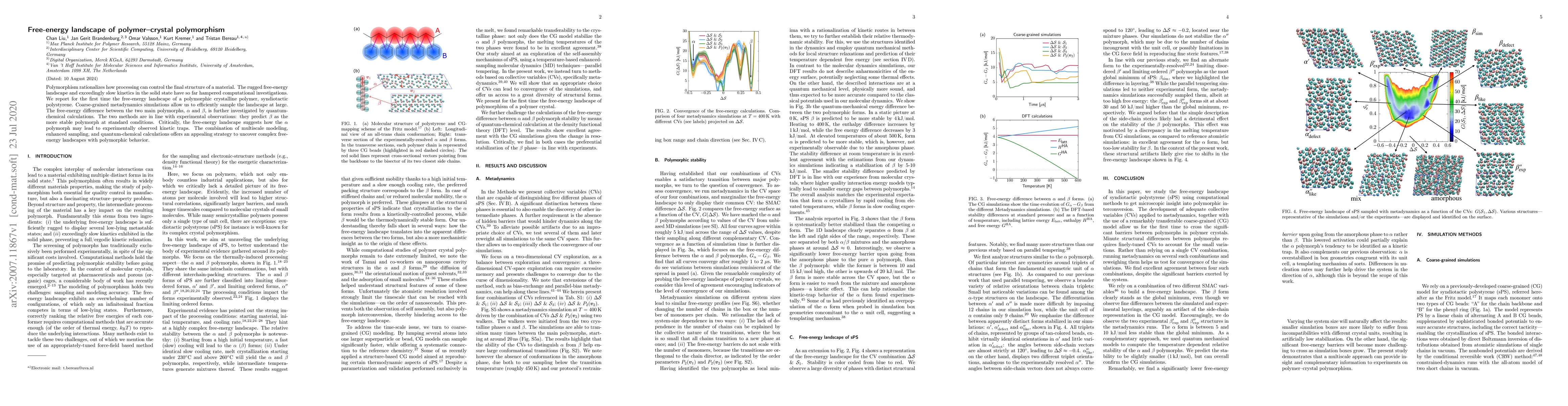 Polymorphism rationalizes how processing can control the final structure of a material. The rugged free-energy landscape and exceedingly slow kinetics in the solid state have so far hampered computational investigations. We report for the first time the free-energy landscape of a polymorphic crystalline polymer, syndiotactic polystyrene. Coarse-grained metadynamics simulations allow us to efficiently sample the landscape at large. The free-energy difference between the two main polymorphs, $\alpha$ and $\beta$, is further investigated by quantum-chemical calculations. The two methods are in line with experimental observations: they predict $\beta$ as the more stable polymorph at standard conditions. Critically, the free-energy landscape suggests how the $\alpha$ polymorph may lead to experimentally observed kinetic traps. The combination of multiscale modeling, enhanced sampling, and quantum-chemical calculations offers an appealing strategy to uncover complex free-energy landscapes with polymorphic behavior.