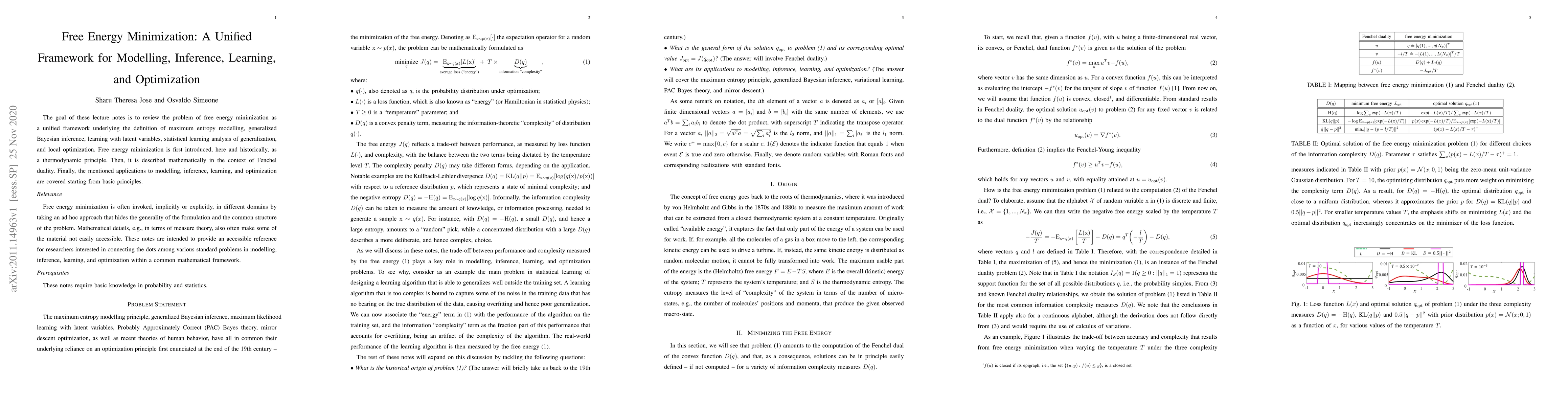 The goal of these lecture notes is to review the problem of free energy minimization as a unified framework underlying the definition of maximum entropy modelling, generalized Bayesian inference, learning with latent variables, statistical learning analysis of generalization,and local optimization. Free energy minimization is first introduced, here and historically, as a thermodynamic principle. Then, it is described mathematically in the context of Fenchel duality. Finally, the mentioned applications to modelling, inference, learning, and optimization are covered starting from basic principles.