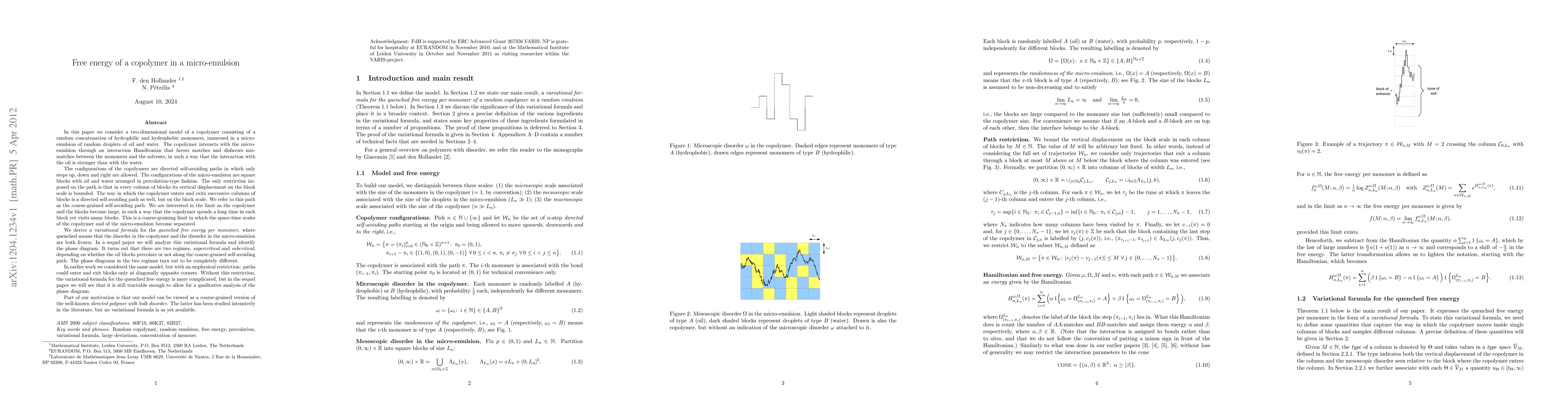 In this paper we consider a two-dimensional model of a copolymer consisting of a random concatenation of hydrophilic and hydrophobic monomers, immersed in a micro-emulsion of random droplets of oil and water. The copolymer interacts with the micro-emulsion through an interaction Hamiltonian that favors matches and disfavors mismatches between the monomers and the solvents, in such a way that the interaction with the oil is stronger than with the water. The configurations of the copolymers are directed self-avoiding paths in which only steps up, down and right are allowed. The configurations of the micro-emulsion are square blocks with oil and water arranged in percolation-type fashion. The only restriction imposed on the path is that in every column of blocks its vertical displacement on the block scale is bounded. The way in which the copolymer enters and exits successive columns of blocks is a directed self-avoiding path as well, but on the block scale. We refer to this path as the coarse-grained self-avoiding path. We are interested in the limit as the copolymer and the blocks become large, in such a way that the copolymer spends a long time in each block yet visits many blocks. This is a coarse-graining limit in which the space-time scales of the copolymer and of the micro-emulsion become separated. We derive a variational formula for the quenched free energy per monomer, where quenched means that the disorder in the copolymer and the disorder in the micro-emulsion are both frozen. In a sequel paper we will analyze this variational formula and identify the phase diagram. It turns out that there are two regimes, supercritical and subcritical, depending on whether the oil blocks percolate or not along the coarse-grained self-avoiding path. The phase diagrams in the two regimes turn out to be completely different.