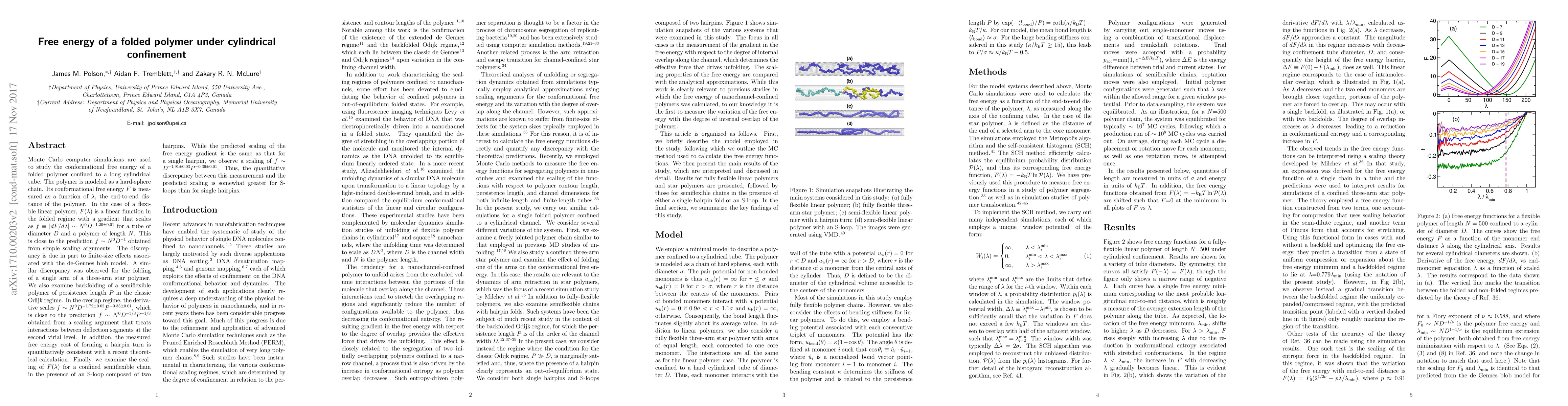 Monte Carlo simulations reveal the conformational free energy of folded polymers confined in cylindrical tubes, showing discrepancies in scaling laws compared to theoretical predictions, particularly due to finite-size effects and semiflexibility. The free energy gradient scales differently than expected for both single and multiple hairpin structures.