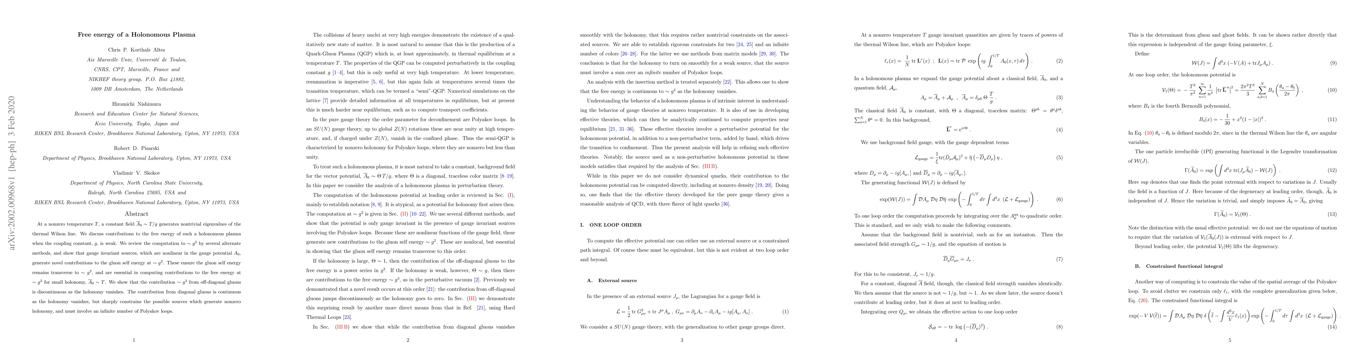 At a nonzero temperature T, a constant field $\overline{A}_0 \sim T/g$ generates nontrivial eigenvalues of the thermal Wilson line. We discuss contributions to the free energy of such a holonomous plasma when the coupling constant, $g$, is weak. We review the computation to $\sim g^2$ by several alternate methods, and show that gauge invariant sources, which are nonlinear in the gauge potential $A_0$, generate novel contributions to the gluon self energy at $\sim g^2$. These ensure the gluon self energy remains transverse to $\sim g^2$, and are essential in computing contributions to the free energy at $\sim g^3$ for small holonomy, $\overline{A}_0 \sim T$. We show that the contribution $\sim g^3$ from off-diagonal gluons is discontinuous as the holonomy vanishes. The contribution from diagonal gluons is continuous as the holonomy vanishes, but sharply constrains the possible sources which generate nonzero holonomy, and must involve an infinite number of Polyakov loops.