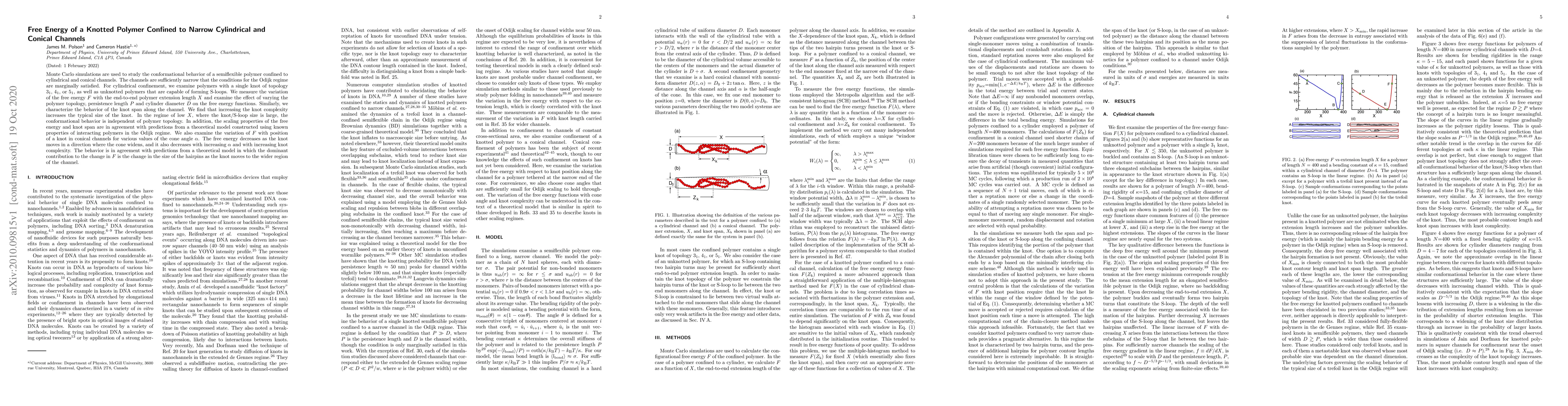 Monte Carlo simulations reveal how semiflexible polymers with knots or S-loops behave in narrow cylindrical and conical channels, showing that knot complexity increases knot size and free energy decreases as knots move towards wider channel regions, aligning with theoretical predictions.