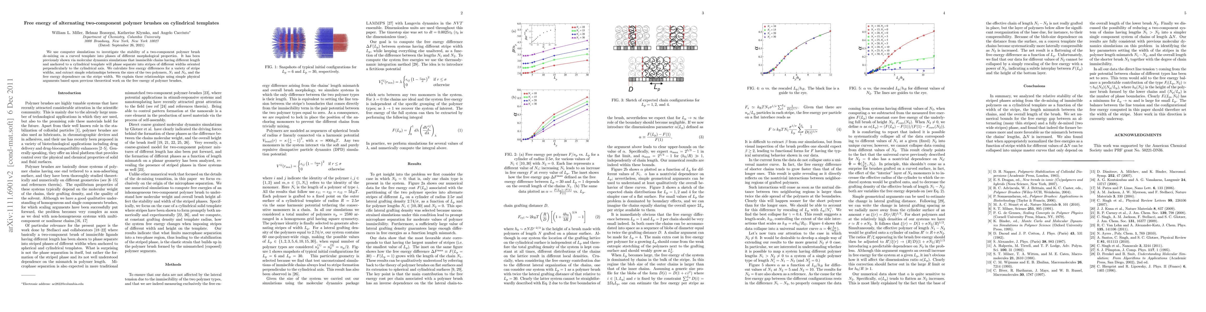 This paper uses computer simulations to study the stability and phase separation of two-component polymer brushes on cylindrical templates. It reveals relationships between polymer chain lengths and free energy differences for different stripe widths, explaining these findings through theoretical models of polymer brush free energy.