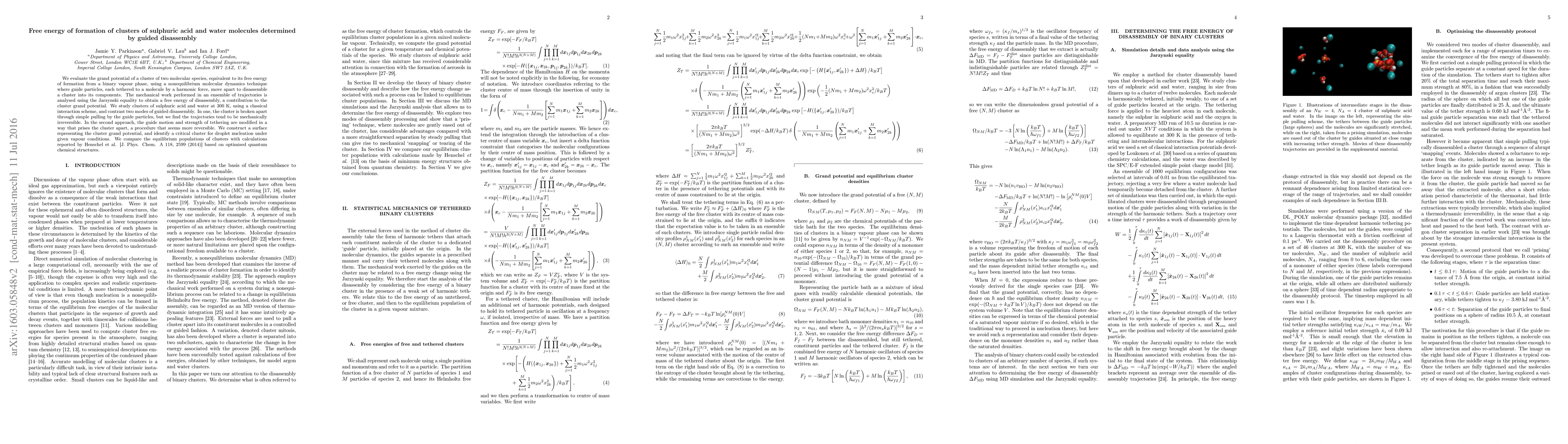 We evaluate the grand potential of a cluster of two molecular species, equivalent to its free energy of formation from a binary vapour phase, using a nonequilibrium molecular dynamics technique where guide particles, each tethered to a molecule by a harmonic force, move apart to disassemble a cluster into its components. The mechanical work performed in an ensemble of trajectories is analysed using the Jarzynski equality to obtain a free energy of disassembly, a contribution to the cluster grand potential. We study clusters of sulphuric acid and water at 300 K, using a classical interaction scheme, and contrast two modes of guided disassembly. In one, the cluster is broken apart through simple pulling by the guide particles, but we find the trajectories tend to be mechanically irreversible. In the second approach, the guide motion and strength of tethering are modified in a way that prises the cluster apart, a procedure that seems more reversible. We construct a surface representing the cluster grand potential, and identify a critical cluster for droplet nucleation under given vapour conditions. We compare the equilibrium populations of clusters with calculations reported by Henschel et al. [J. Phys. Chem. A 118, 2599 (2014)] based on optimised quantum chemical structures.
